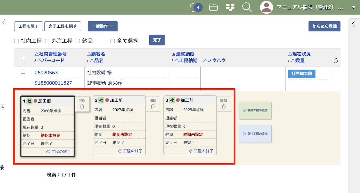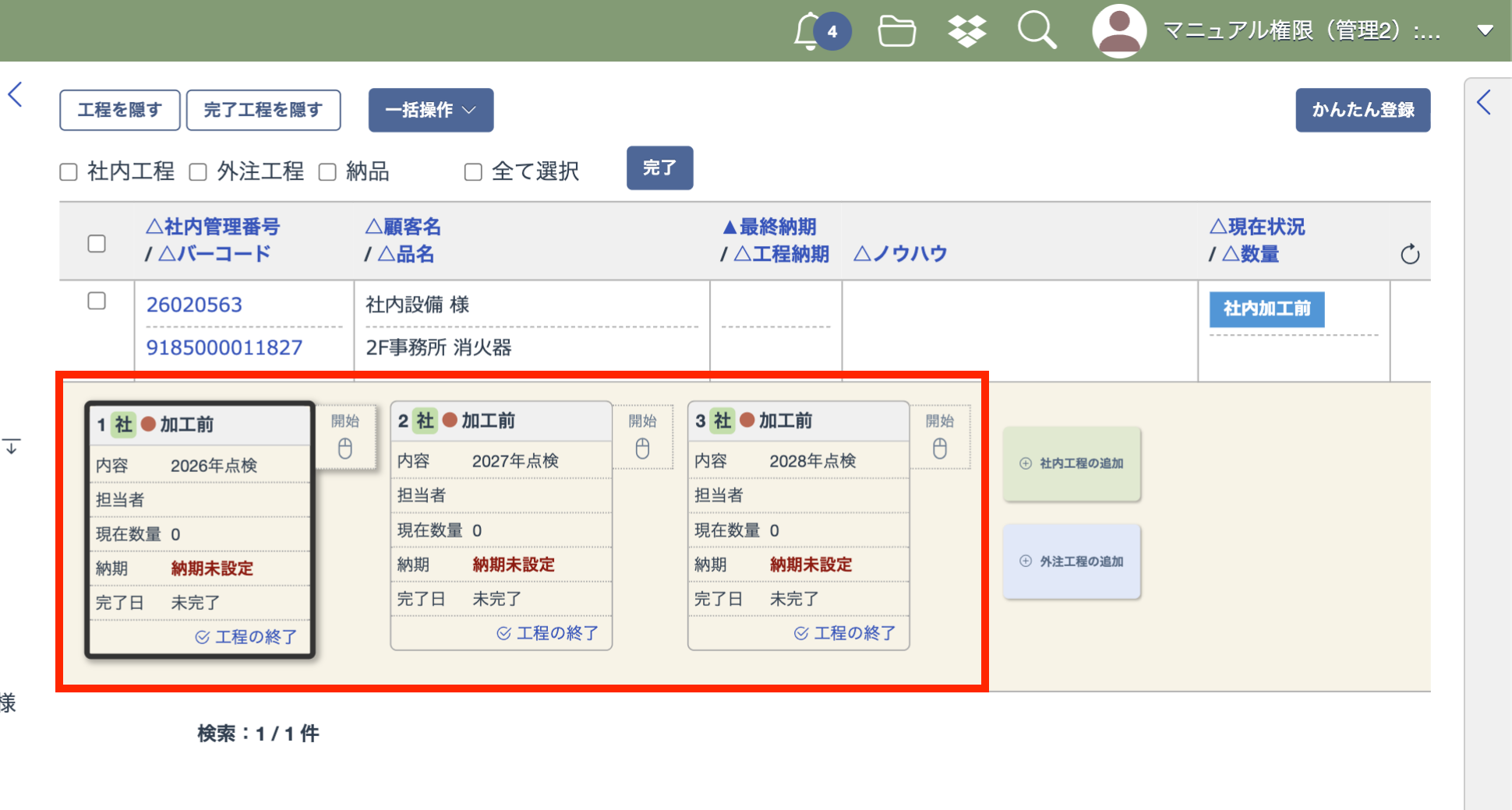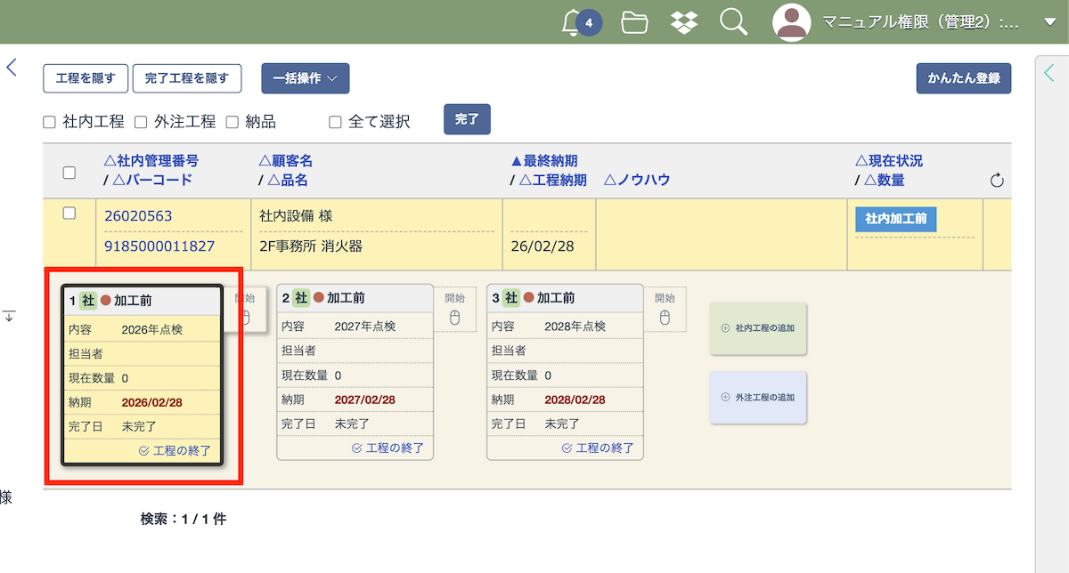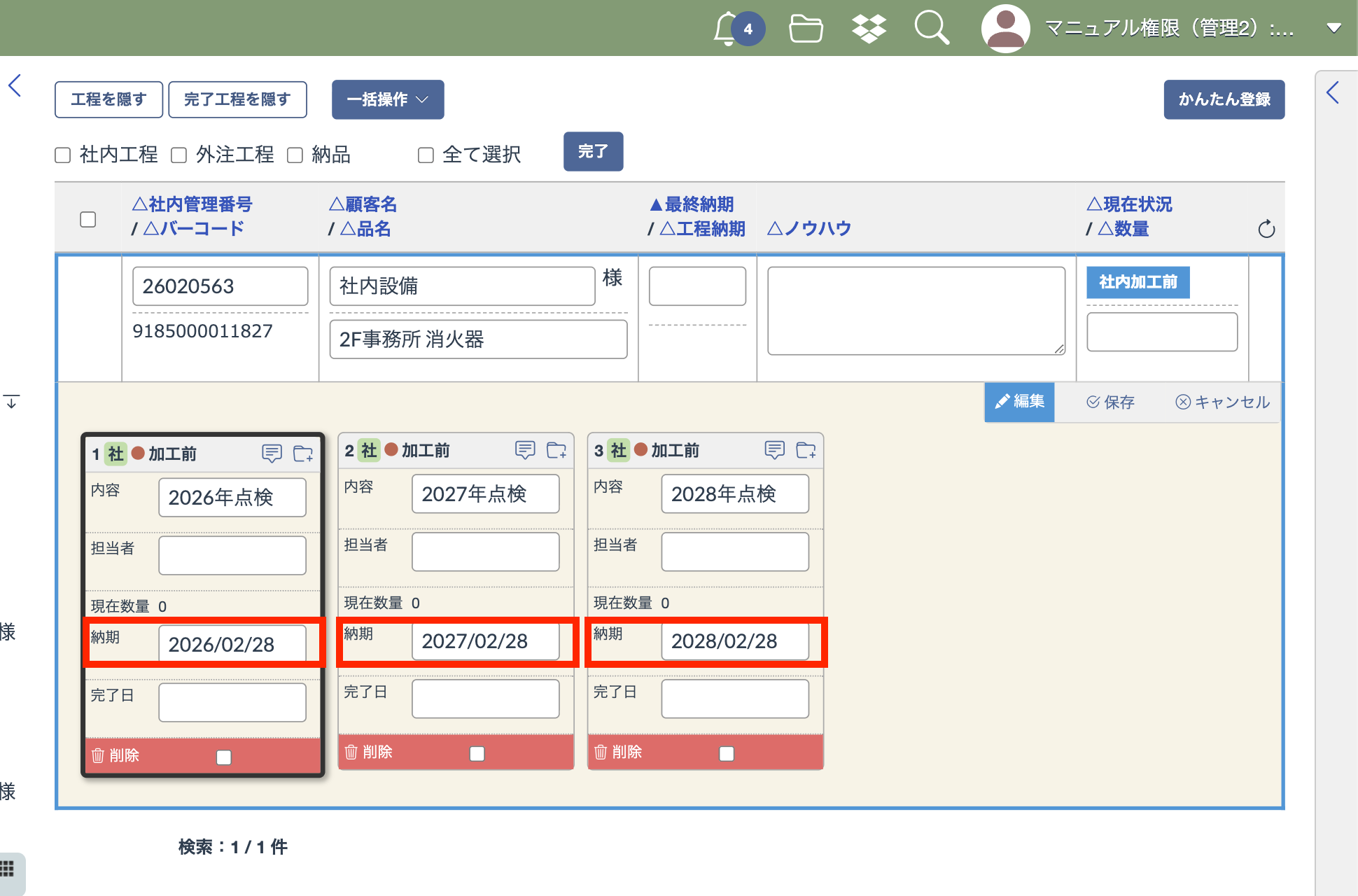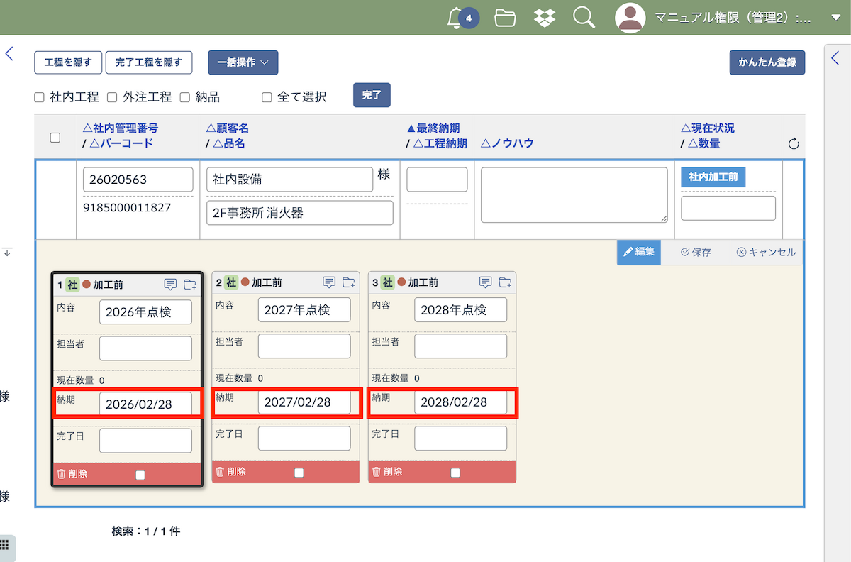 登録した工程の「納期」にメンテナンス予定日を入力します。