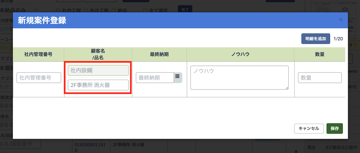 ここでは例として顧客名に「社内設備」、品名に「2F事務所 消火器」と入力します。
