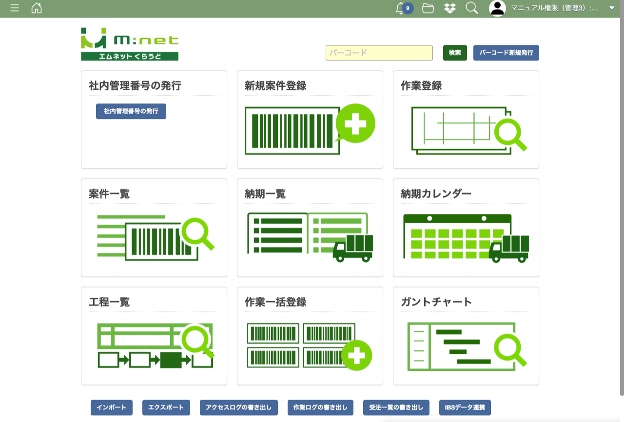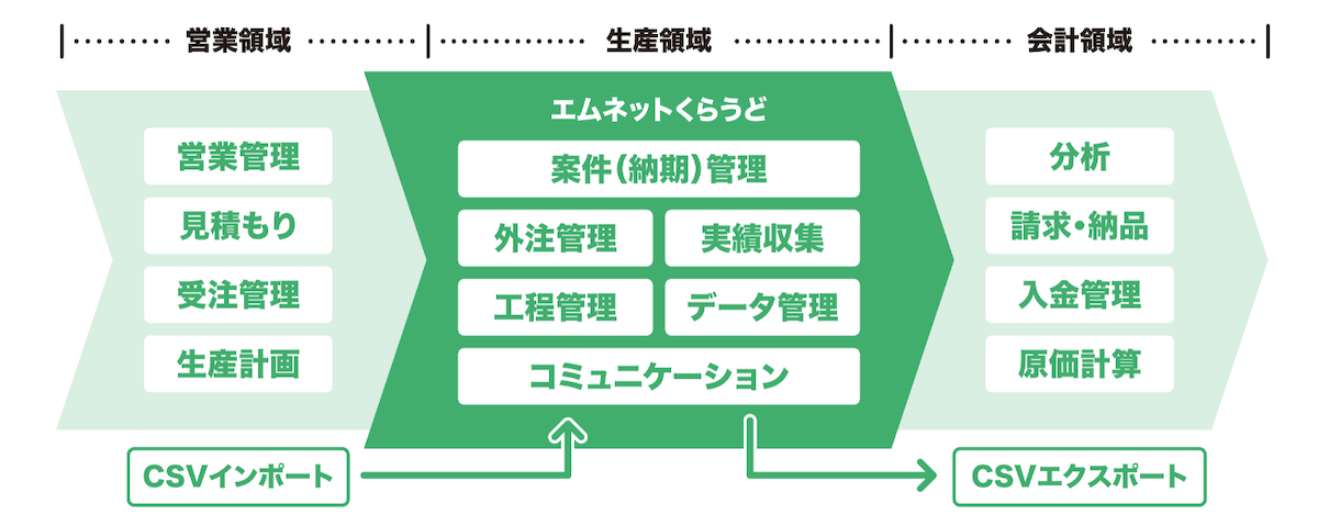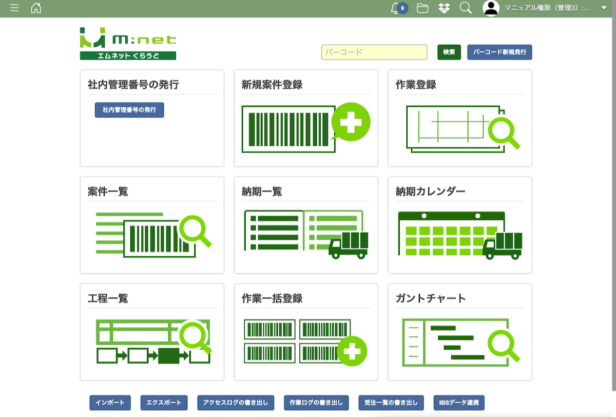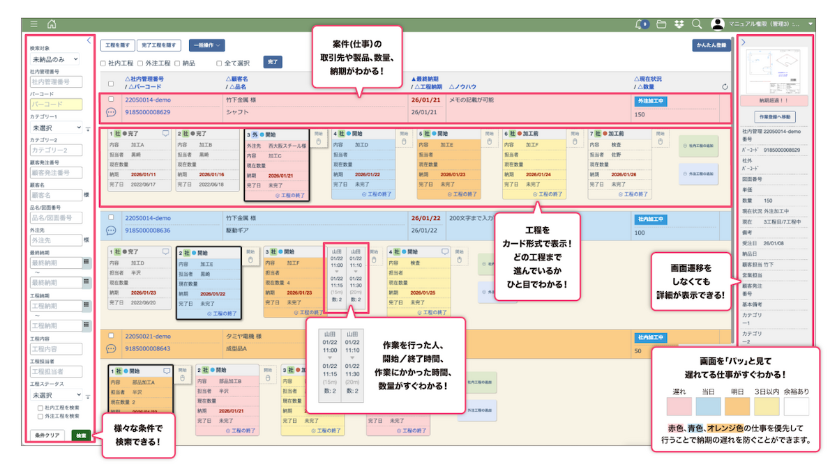 エムネットくらうどは、一般的な生産管理システムとは異なり「仕事の納期」「工程の進捗管理」「作業実績(日報)の収集」を中心としたパソコンに詳しくない人でも使いやすい管理システムです。