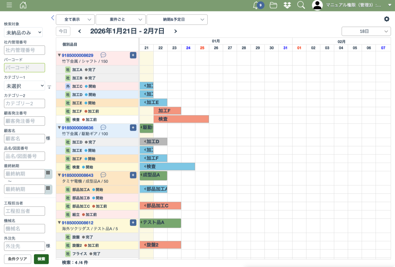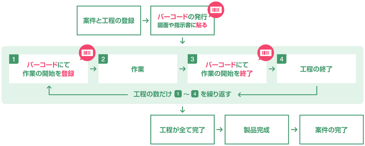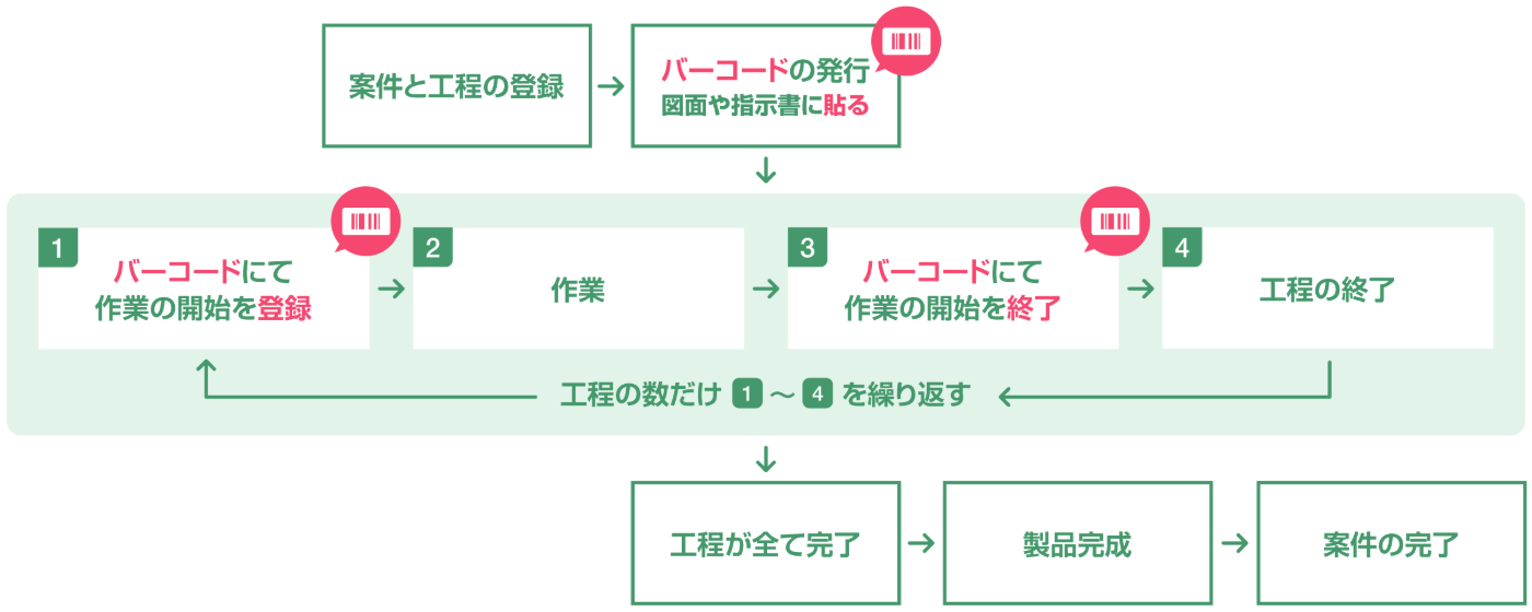 上記の図のような作業の開始、終了の記録を取らずに工程の完了だけを管理するような使い方も可能です。導入当初は工程の完了だけで運用をはじめて、慣れてきたら開始、終了の記録を取るような段階的な導入も可能です。