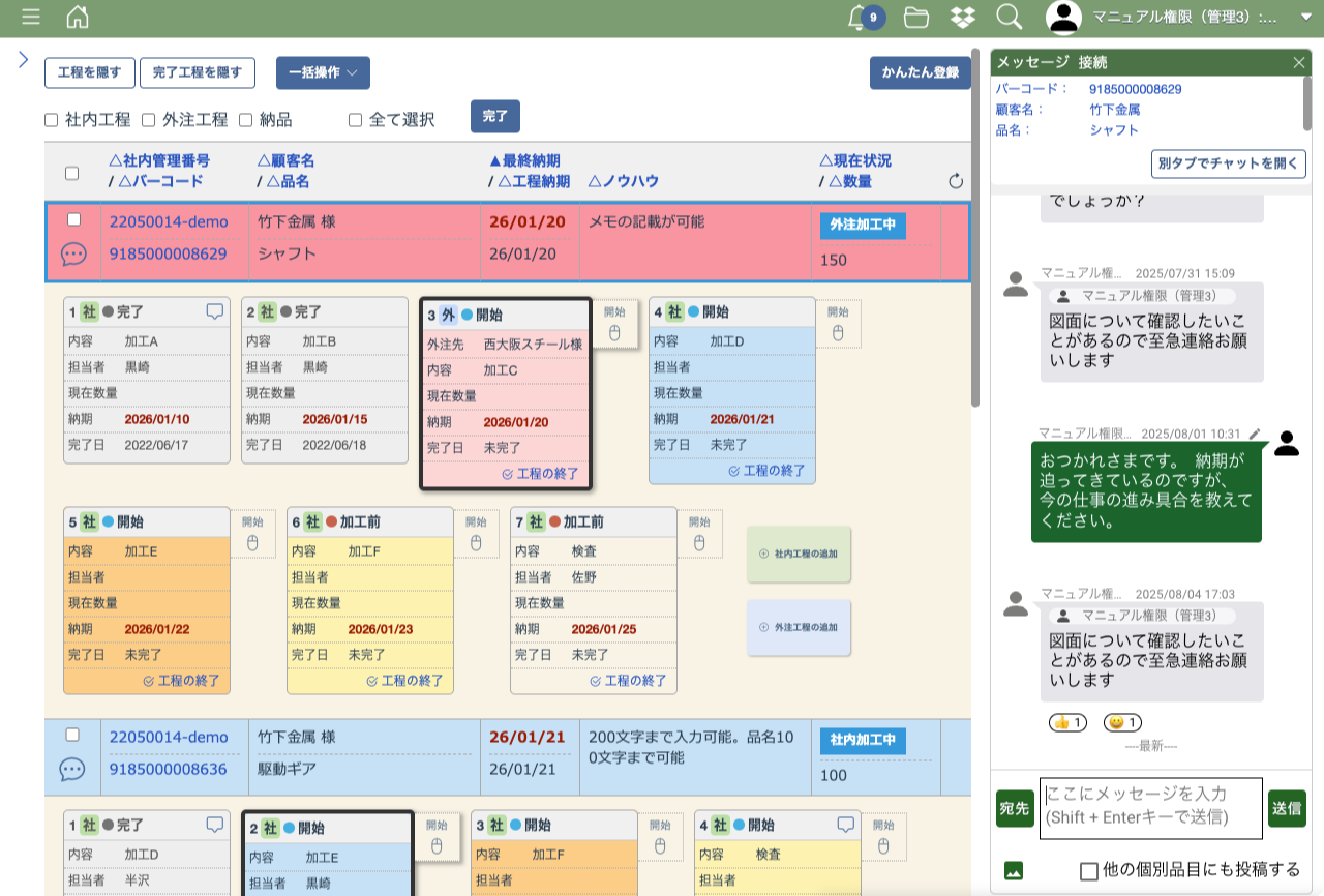 エムネットくらうどは標準でチャット機能を搭載しています。チャット機能はユーザー同士のメッセージのやりとりはもちろん、様々なファイルを送信することもできます。不良品や完成品の写真を記録として残したり、図面やCADなどのデータ、検査表なども案件情報とともに登録することが可能です。