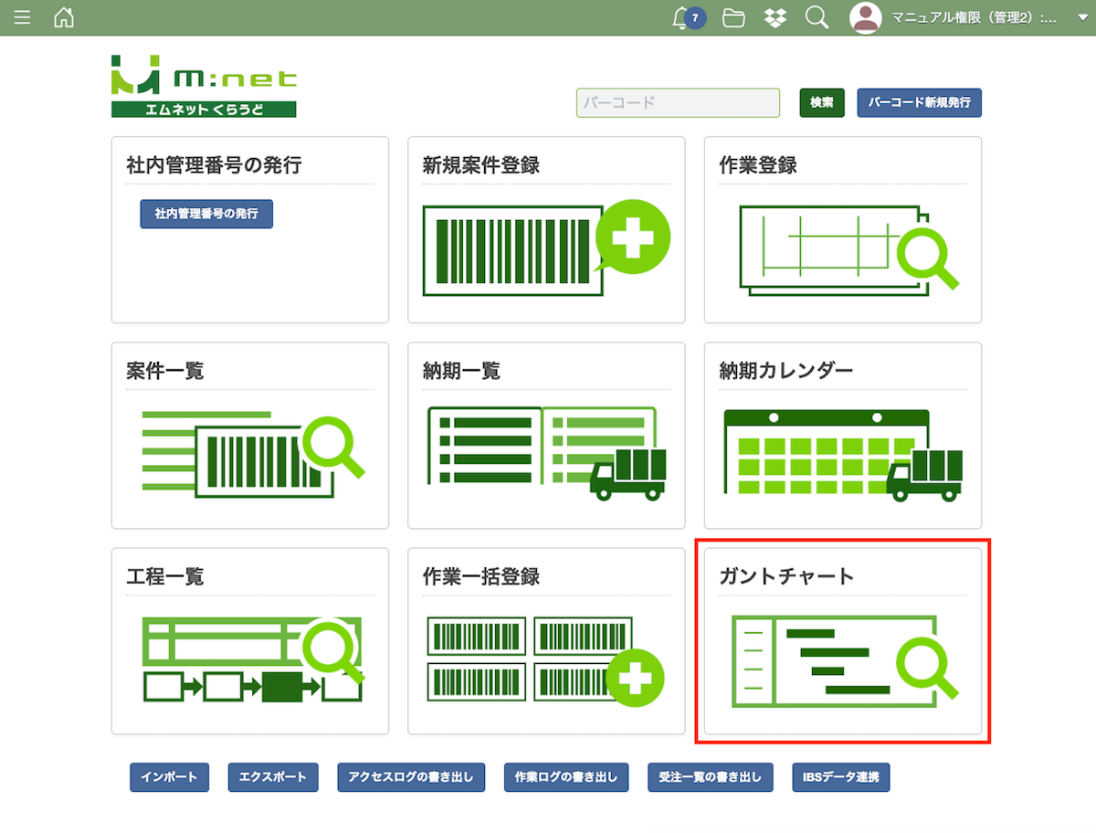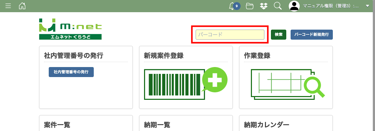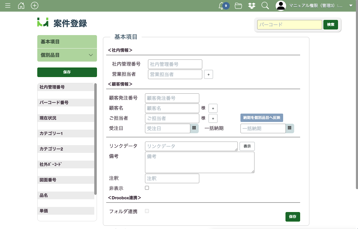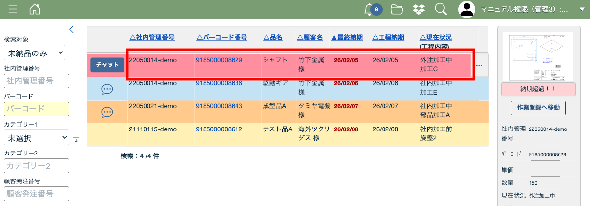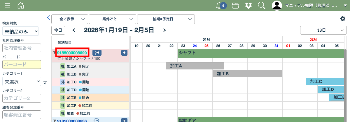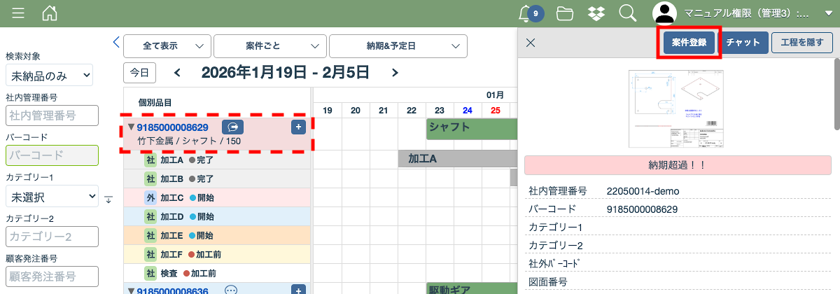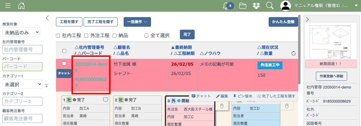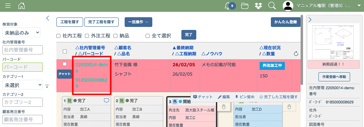 工程一覧画面で該当の案件の「社内管理番号/バーコード番号」を押して開きます。