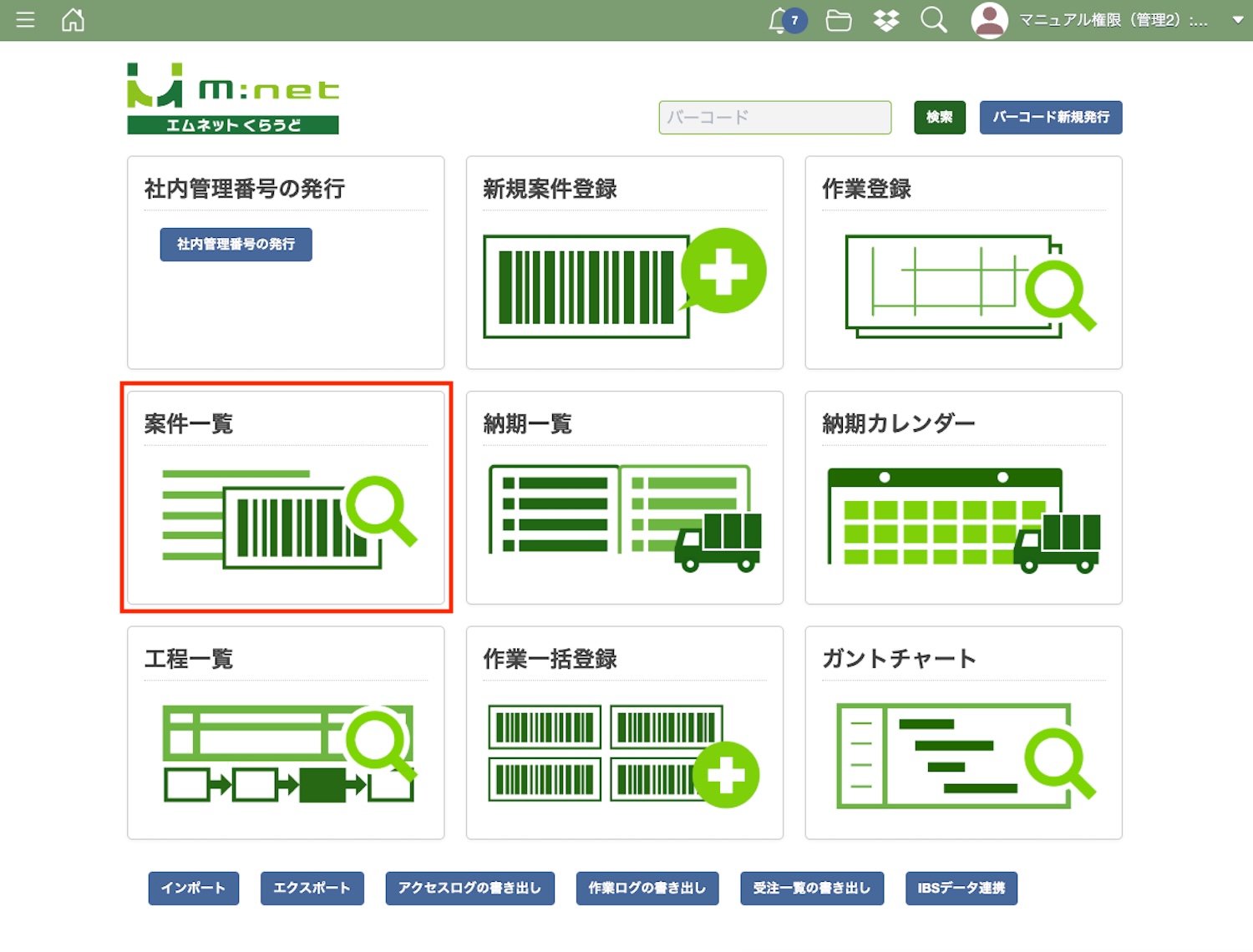 メニュー画面から「案件一覧」を押して案件一覧画面を開きます。