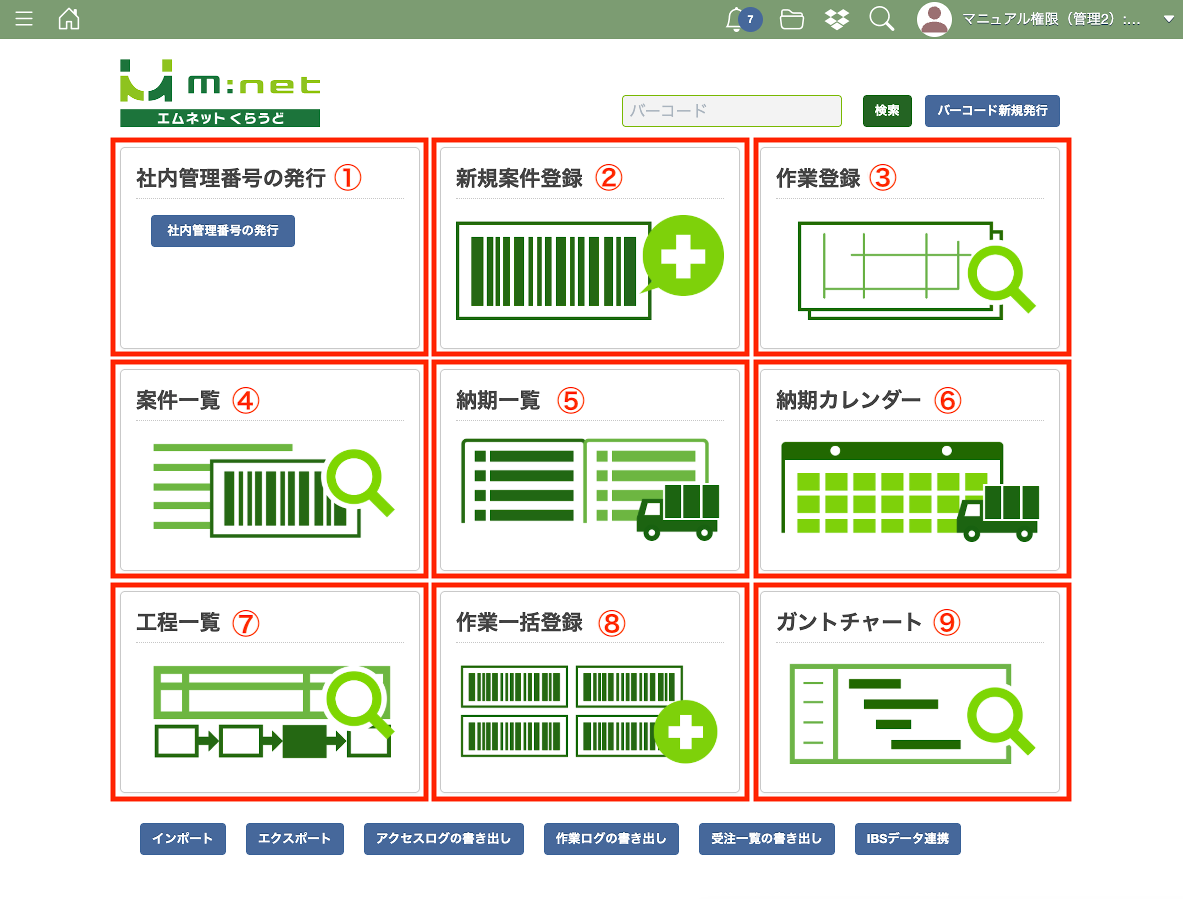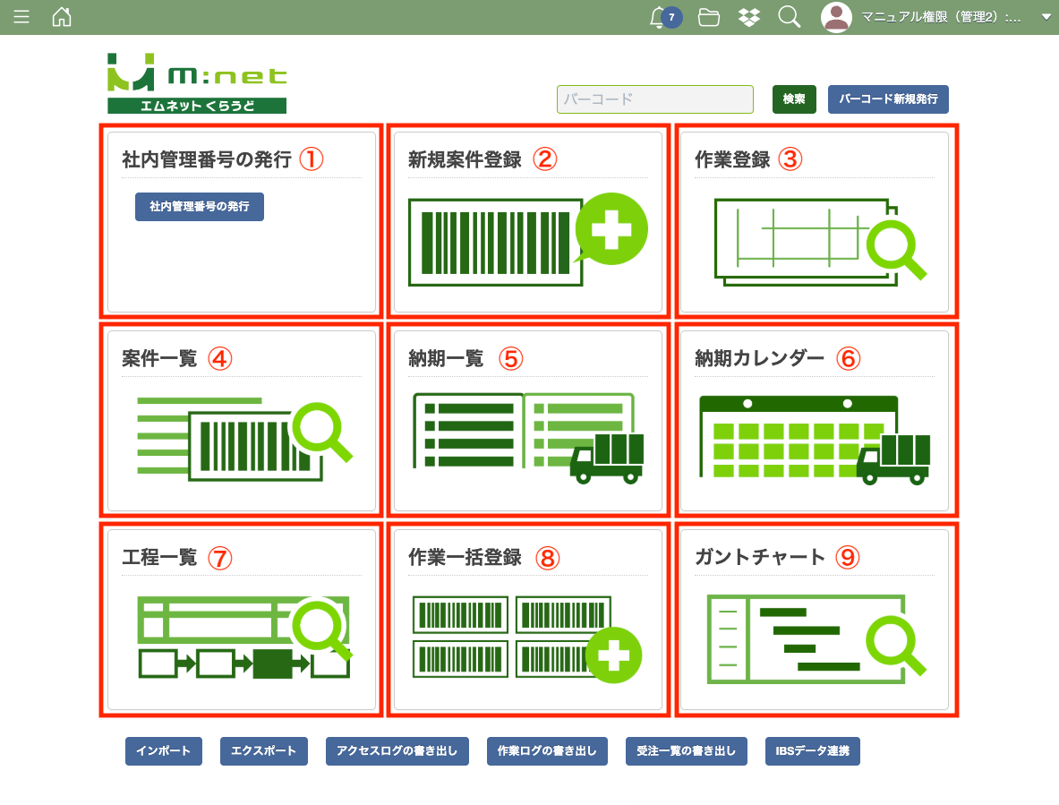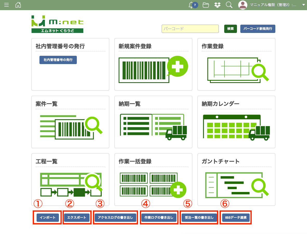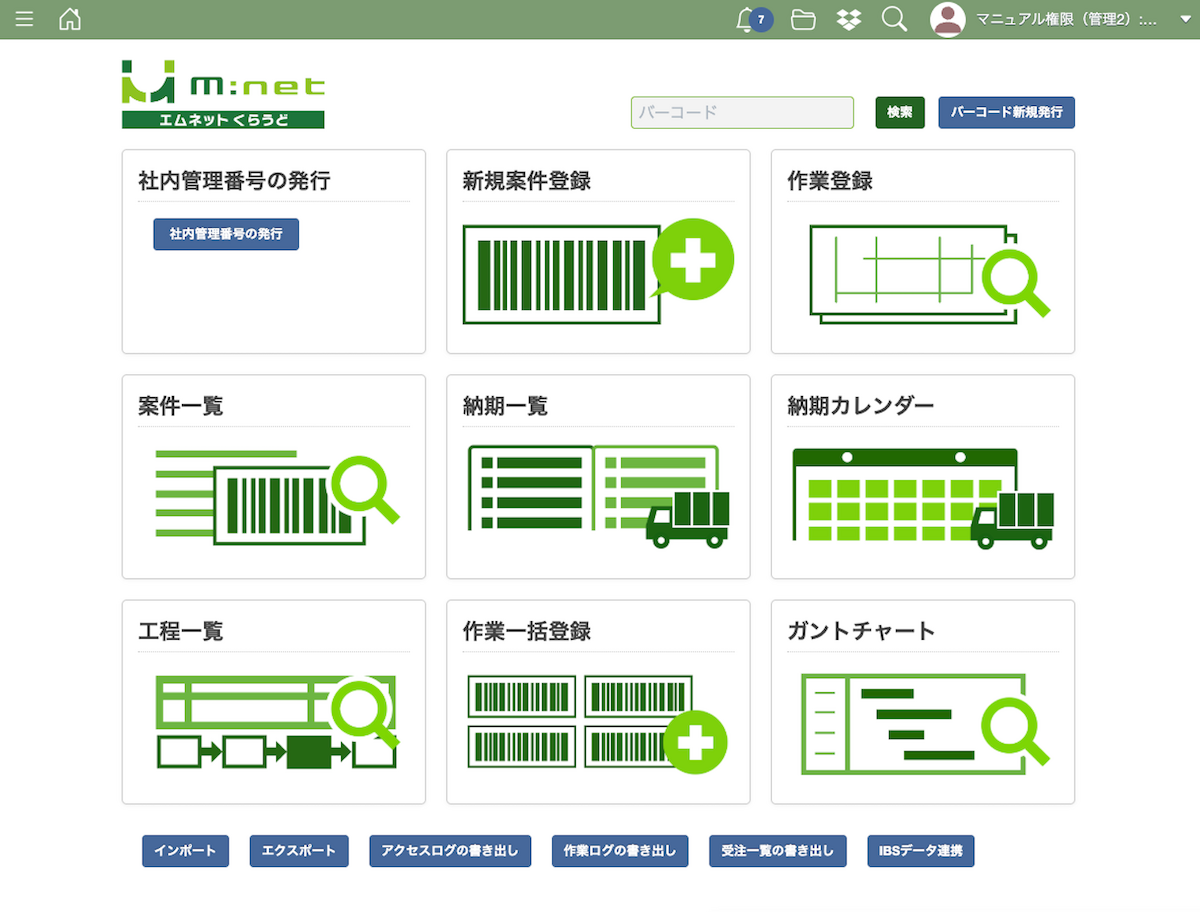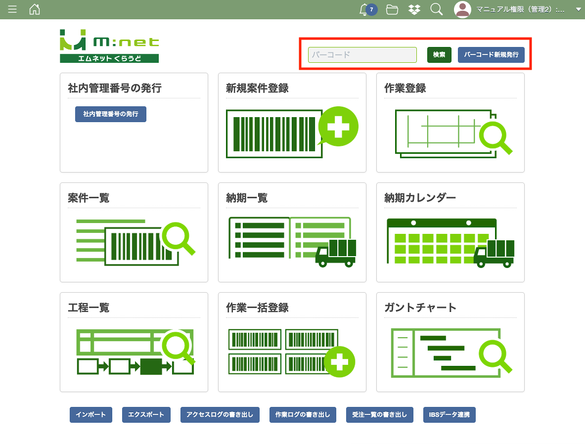 ロゴの右側にはバーコード検索の入力欄とバーコード新規発行ボタンがあります。