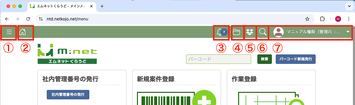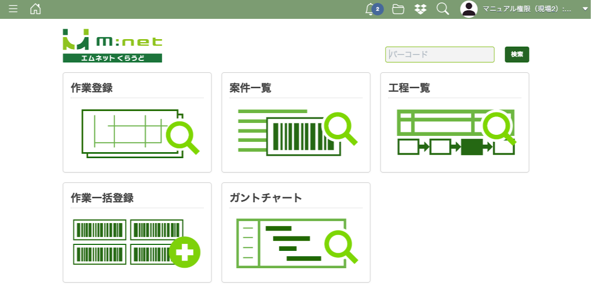 ユーザー権限が「システム管理者」「管理」の場合はすべてのメニューが表示されますが、ユーザー権限が「現場」の場合は新規案件登録などの管理に関わるメニューが表示されません。