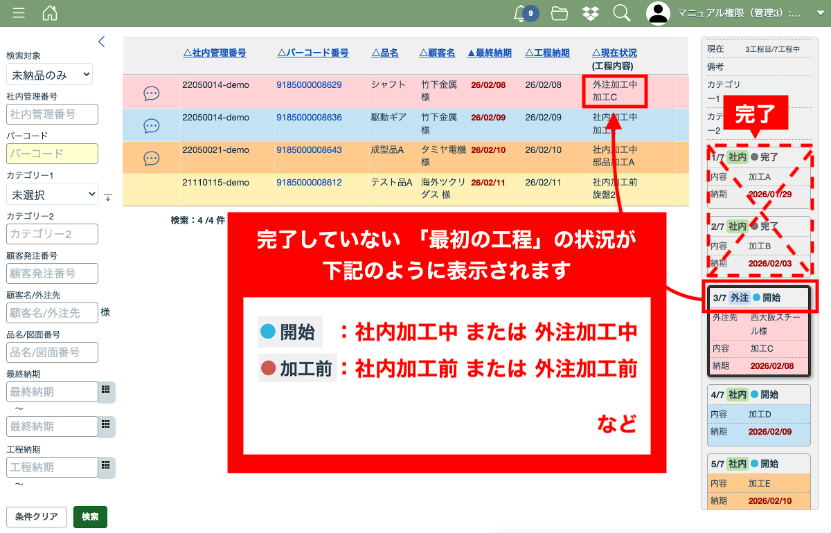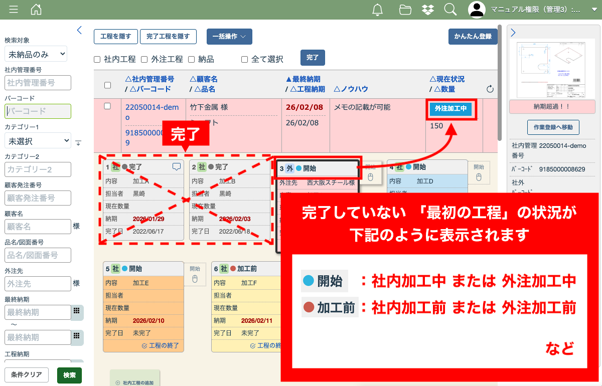 案件一覧、工程一覧画面では現在の工程の状況が表示されます。