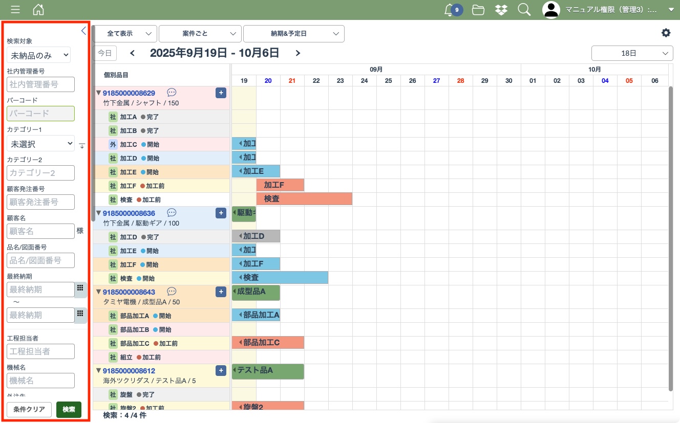 案件一覧画面、工程一覧画面、ガントチャート画面で左端の検索欄を利用して、より目的に応じた検索が可能となります。