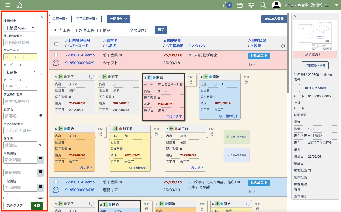 チェックを入れると「工程担当者」「機械名」「外注先」「工程納期」「工程内容」の入力内容に一致した工程のみが表示されます。