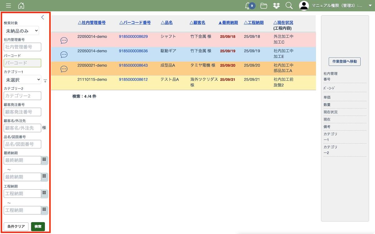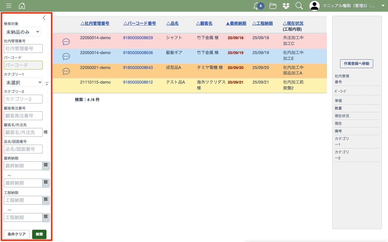 納期などの日程の登録がない場合は、進捗管理で絞り込むことができなくなりますので、納期を入力されることをおすすめいたします。