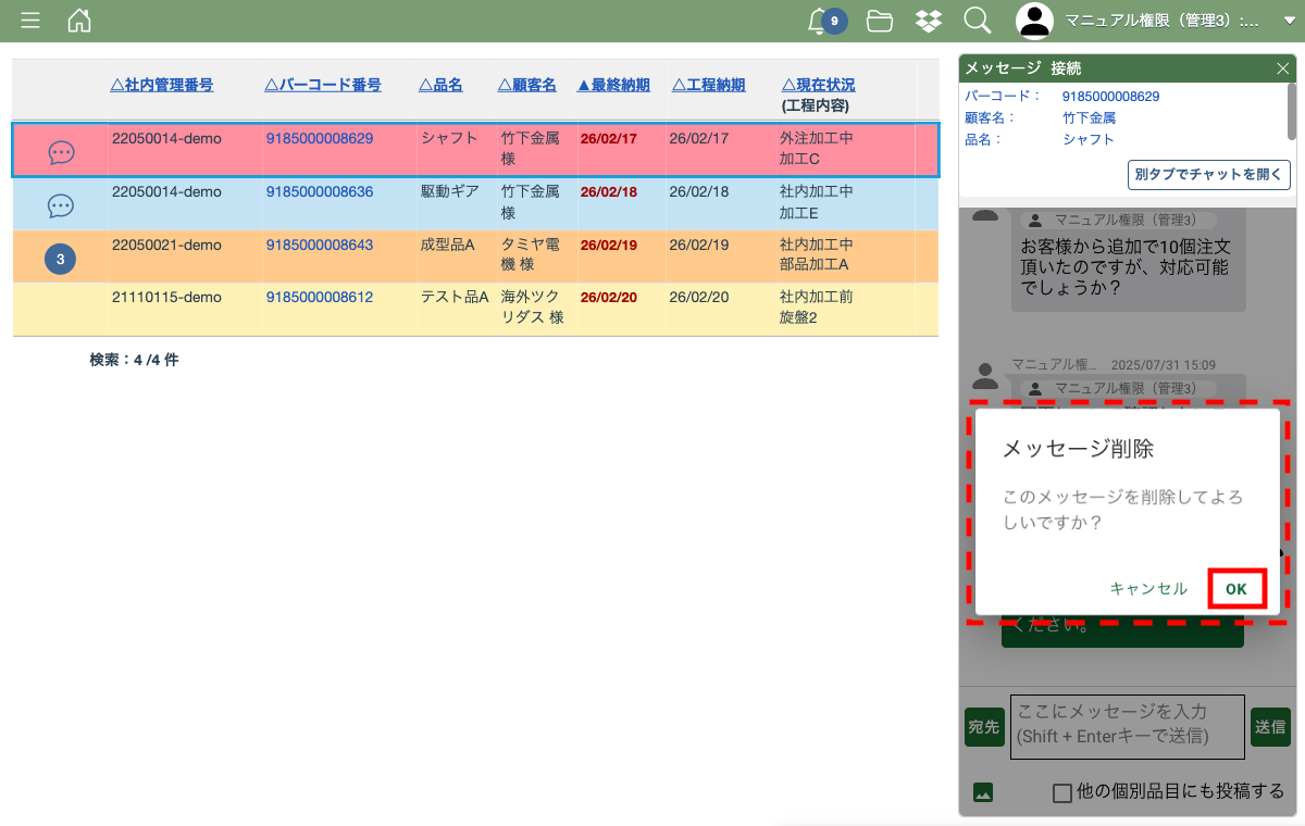 確認の画面が表示されるので、内容を確認して削除する場合は「OK」ボタンを押してください。