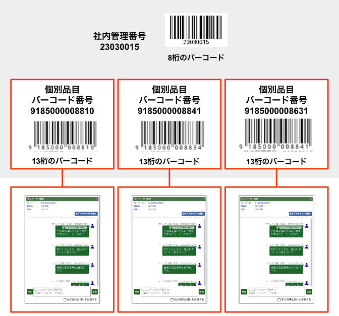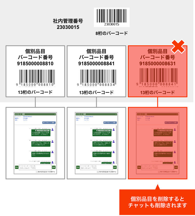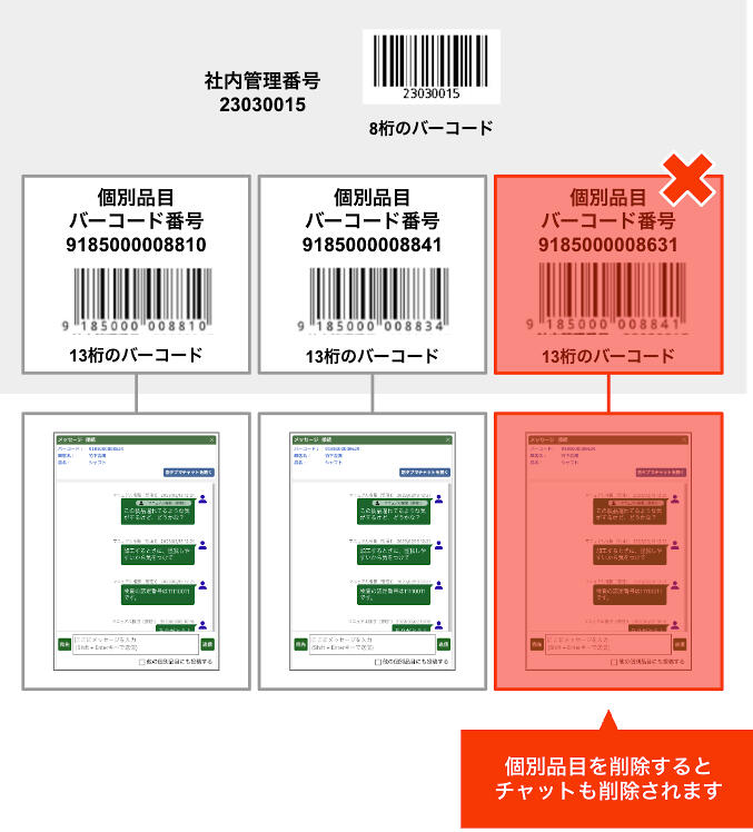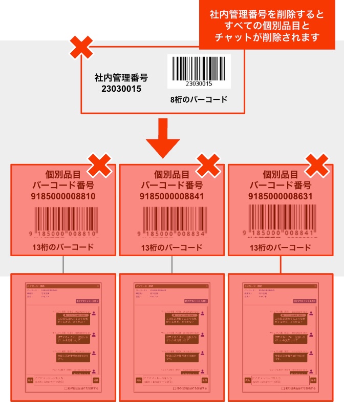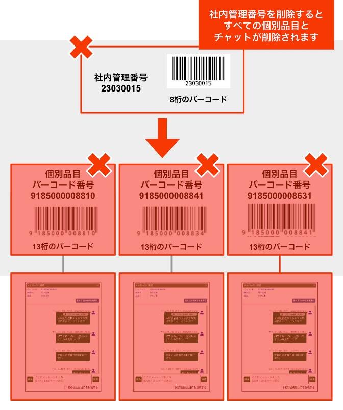 社内番号を削除すると、すべての個別品目とそこに紐付けられたチャットが削除されてしまうため、社内管理番号を削除する際は注意してください。