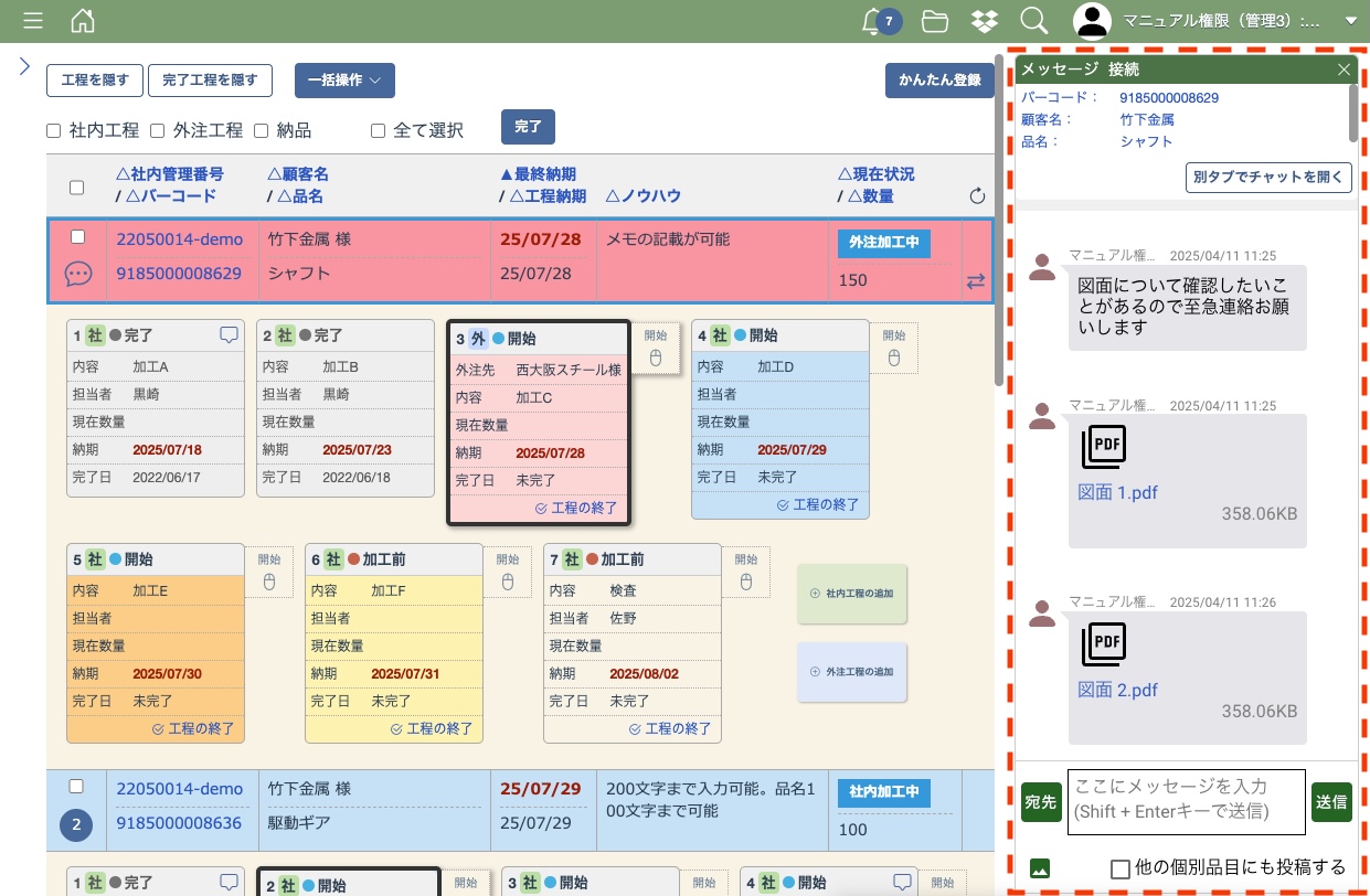 画像や写真、PDFだけでなく図面のCADデータなどもチャットで送信することができますが容量の制限がございますので大きな容量のファイルを送る際はご注意ください。
