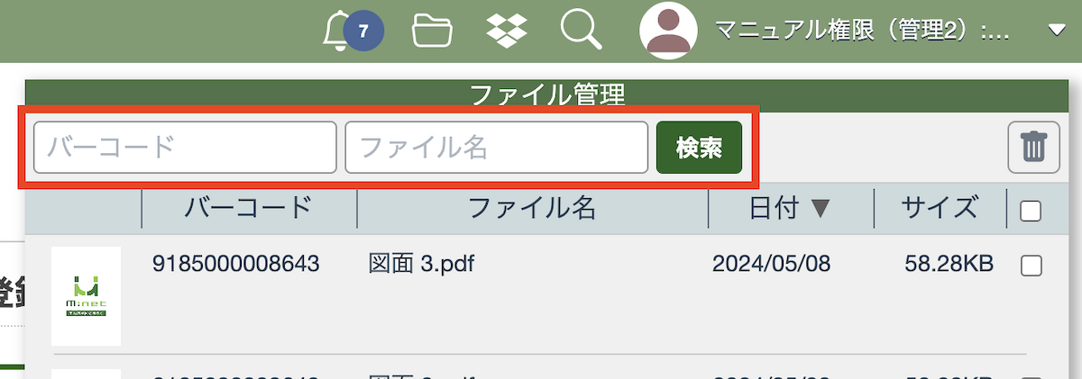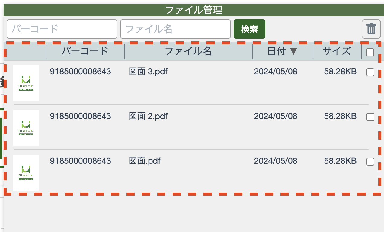 「バーコード」「ファイル名」の検索欄にバーコードまたはファイル名を入力して「検索」ボタンを押してください。