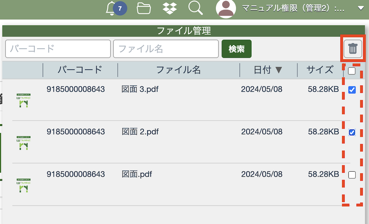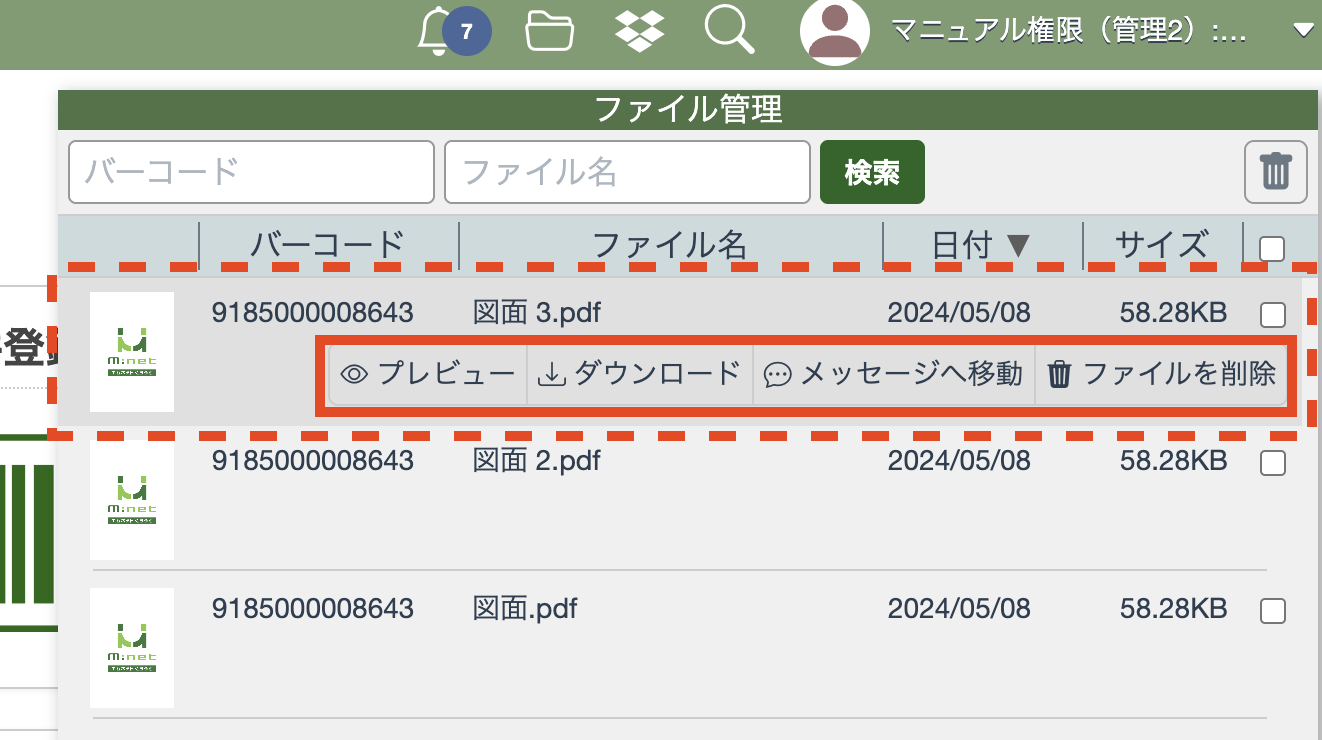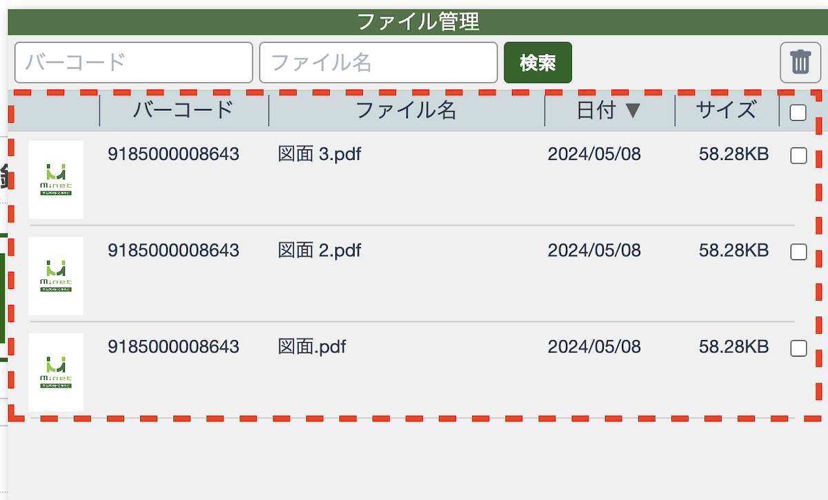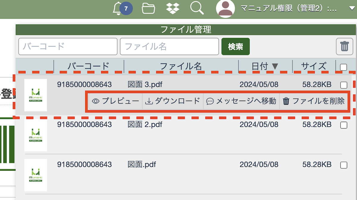 ファイル管理の画面では、ファイルが添付されたチャットのバーコード番号、ファイル名、添付された日付、サイズなどの情報が確認できます。