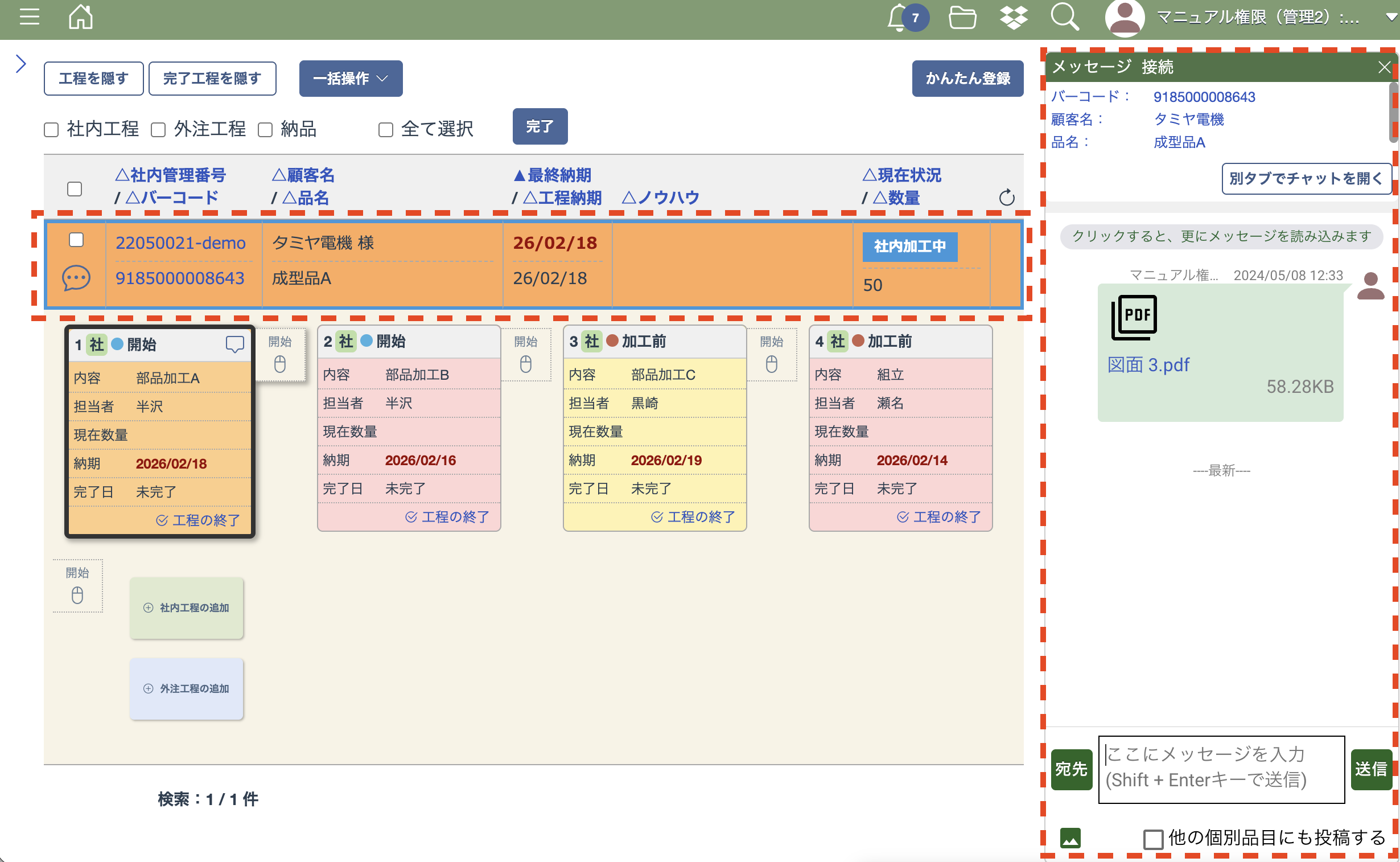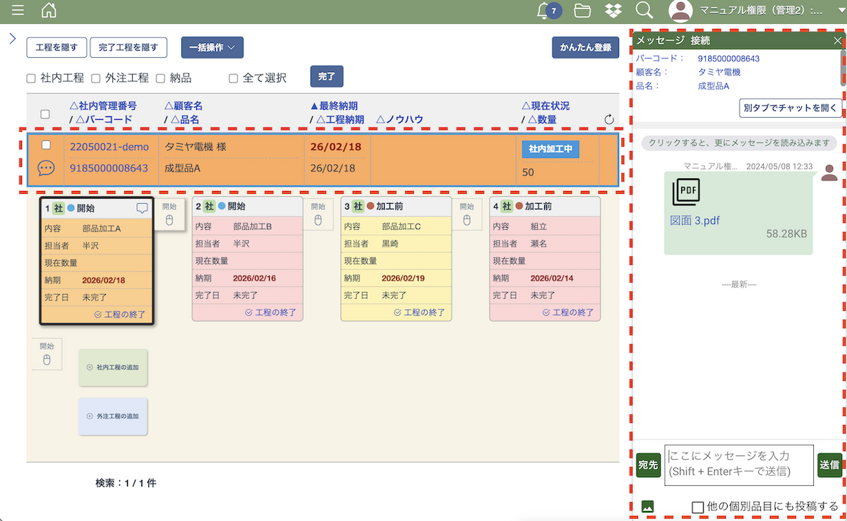 「メッセージへ移動」を押すと工程一覧画面へ遷移して、そのファイルを添付したチャットのメッセージが表示されます。