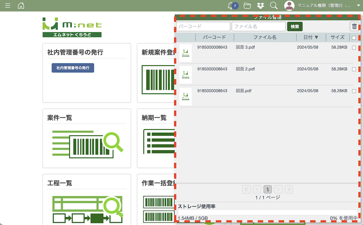 画面の右側にファイル管理の画面が表示され、これまでに自分が送信した添付ファイルの一覧が表示されます。