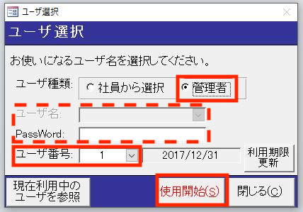管理者を設定した場合はユーザー名を選択する必要が無くなります。