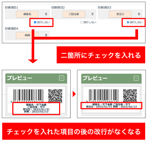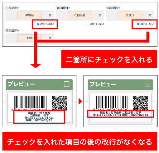 各印刷項目の下にある「改行しない」のチェックボックスを入れると、ラベルに表示される項目が改行されなくなります。(62mm×29mmラベルと62mm長尺ラベルのみ)