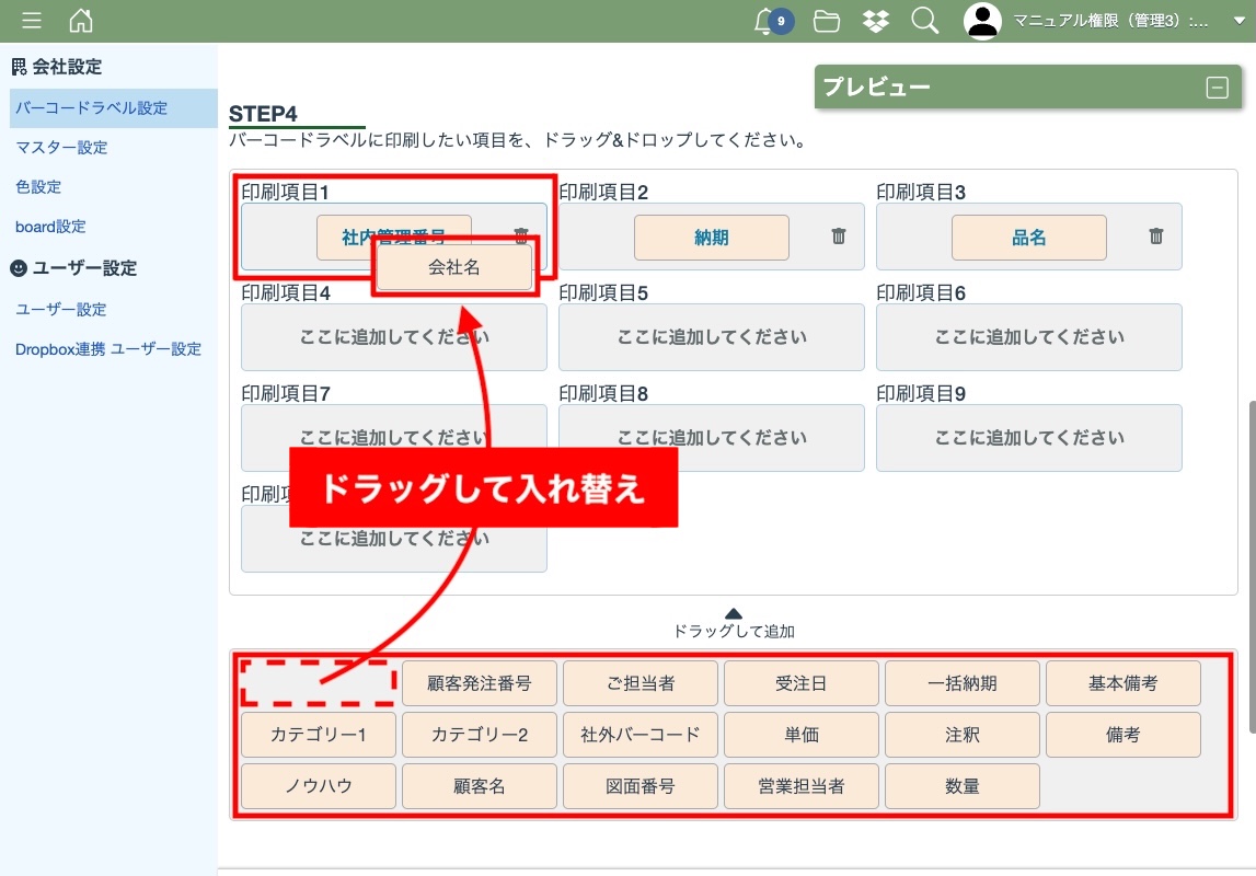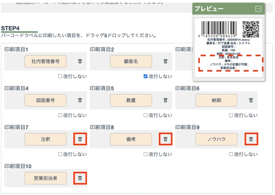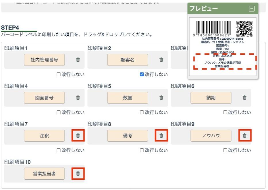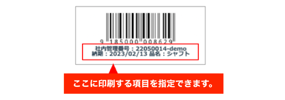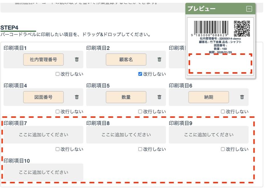 STEP4の手順で、バーコードの下の項目を任意で変更できます。表示したい項目をドラッグして入れ替えができます。