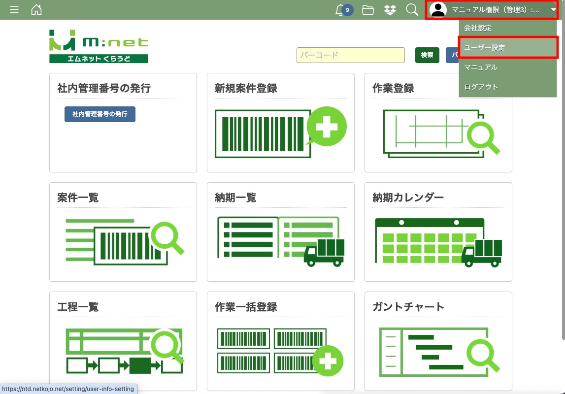 ログインができたら画面右上のユーザー名にカーソルを合わせてください。するとメニューが表示されますので「ユーザー設定」をクリックします。