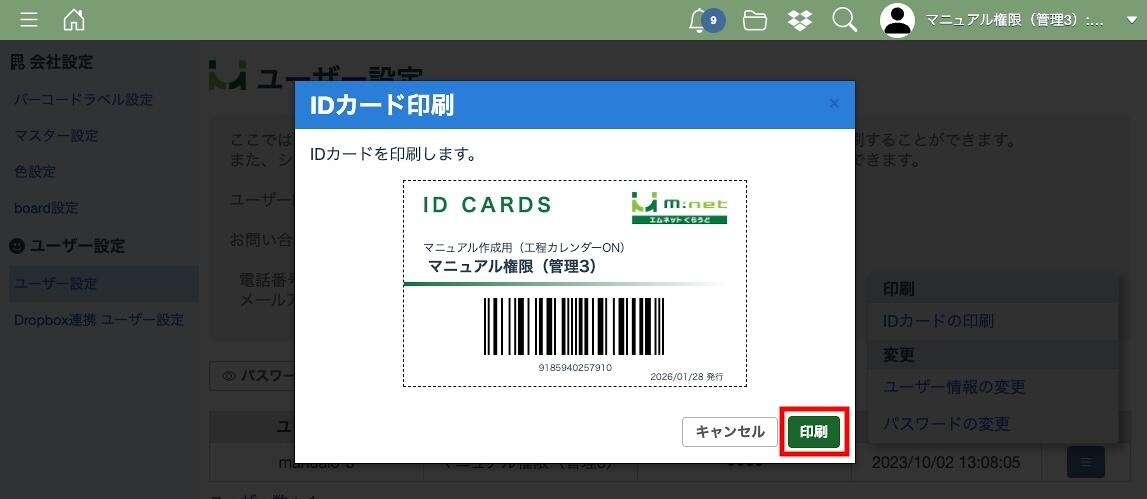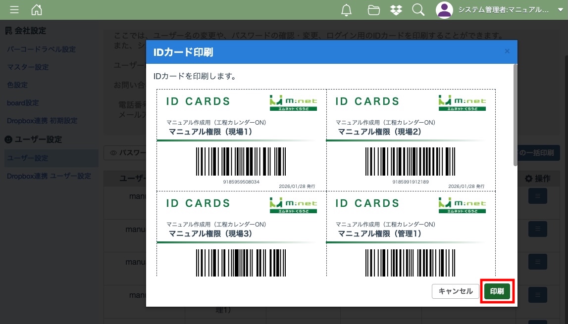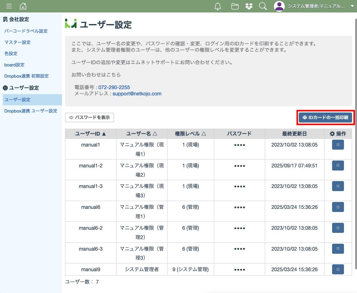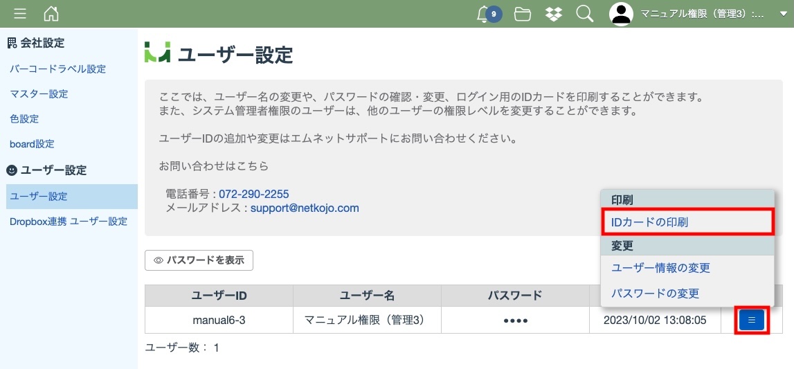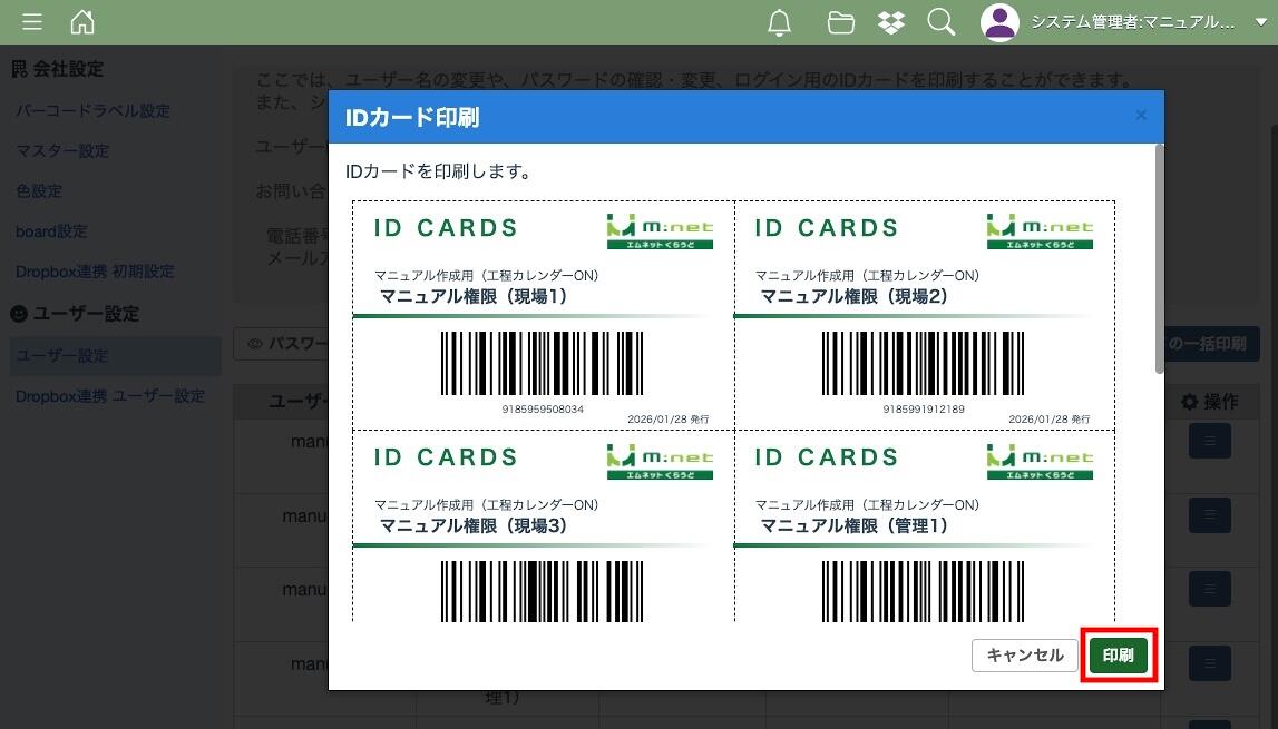 ユーザー設定ではユーザー名の変更や、パスワードの確認・変更、ログイン用のIDカードを印刷することができます。