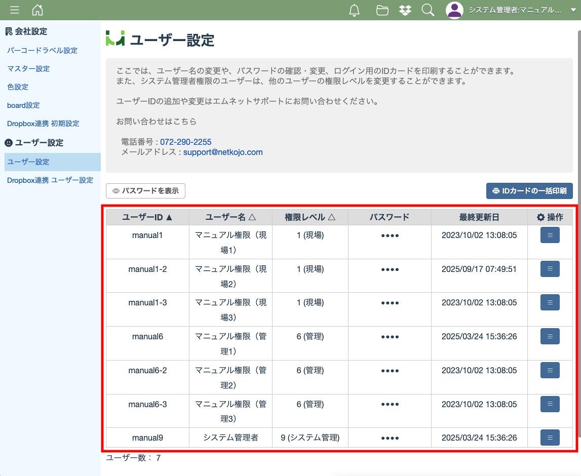 権限レベルが「システム管理者」のユーザーはすべてのユーザーの登録情報が表示されます。