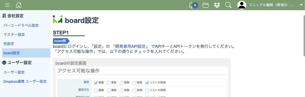画面に表示される連絡先にお電話またはメールでお問い合わせください。「会社設定」の画面は「管理者」の権限を持つユーザーにしか表示されません。boardとの連携などの設定を行う場合は「管理者」の権限を持つユーザーが行ってください。