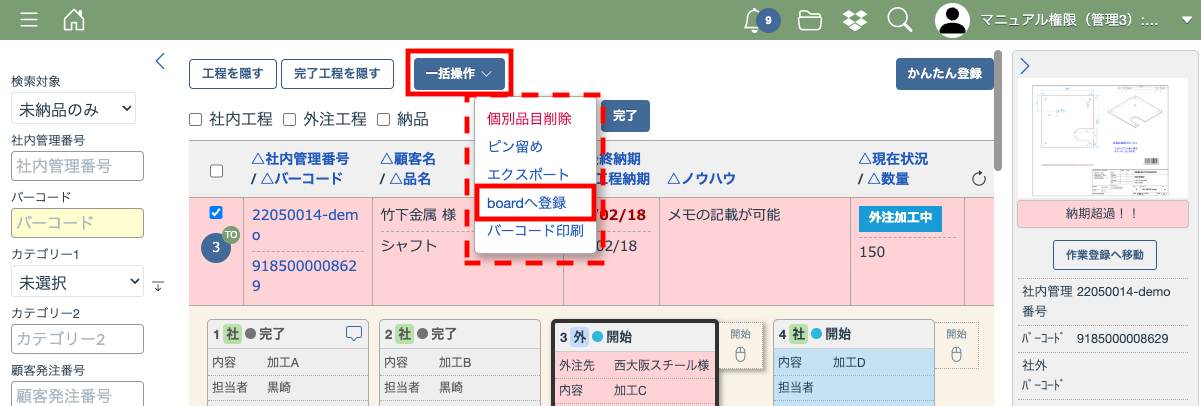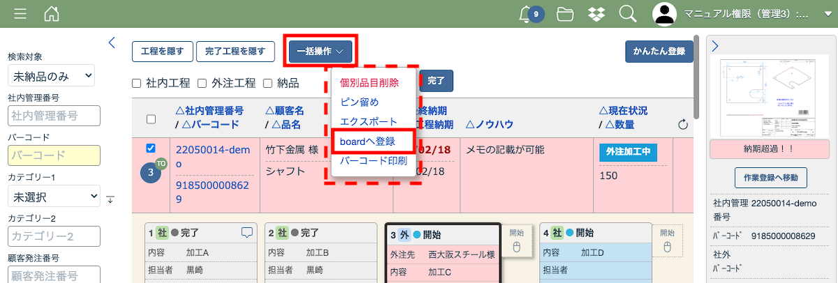 「一括操作」ボタンを押し、表示されたメニューから「boardへ登録」を選択します。