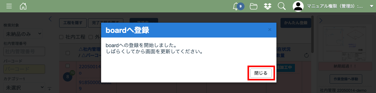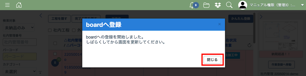 boardへの登録を開始したというメッセージが表示されますので「閉じる」ボタンを押してください。