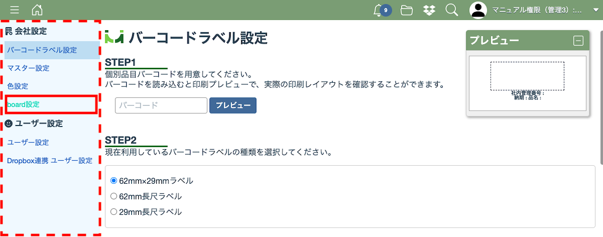 会社設定の画面が表示されたら画面左側のメニューから「board設定」を選択してください。