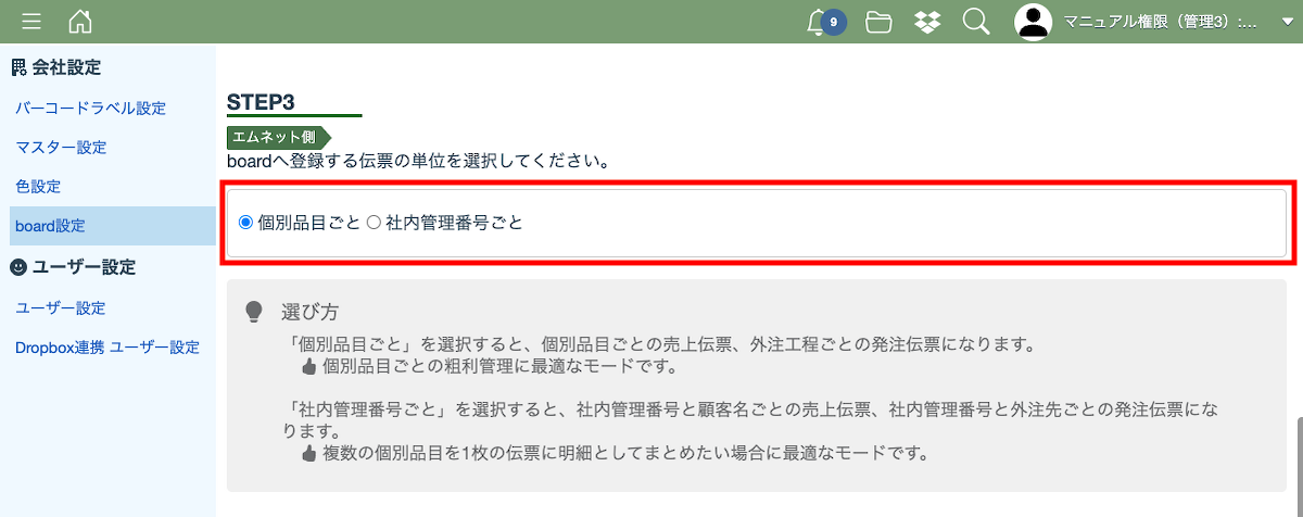 board側で設定が終わったら、エムネットくらうどの画面に戻ってSTEP2に進みます。