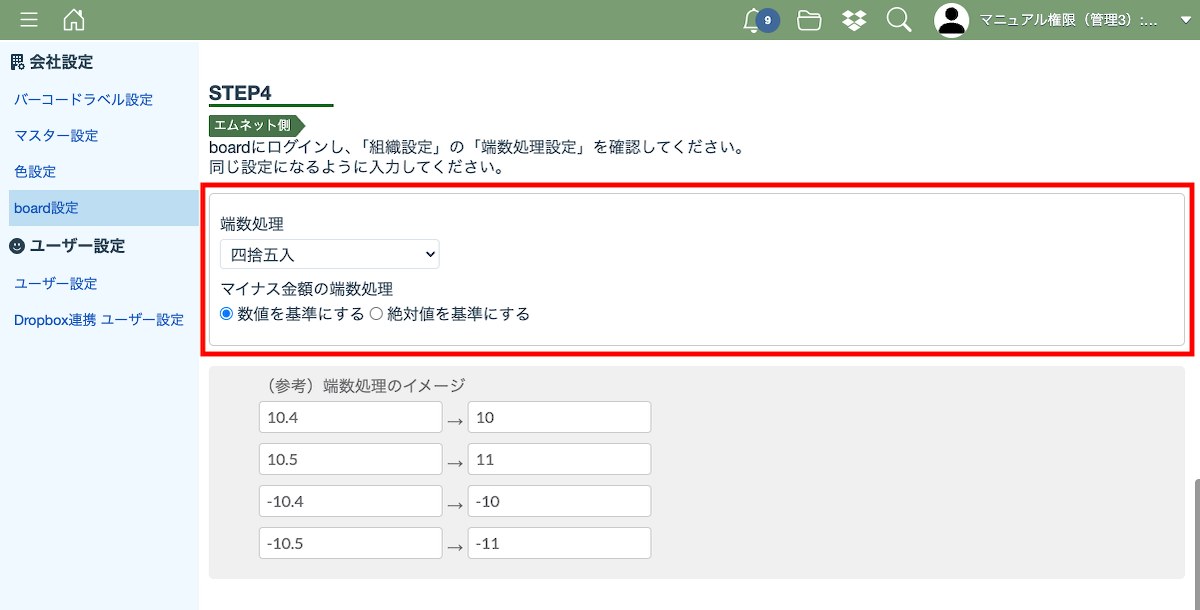 boardにログインし「組織設定」の「端数処理設定」を確認し、STEP4に同じ設定を行ってください。