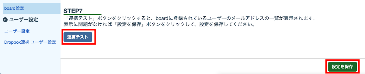 STEP7の「連携テスト」ボタンを押すとboardに登録されているユーザーのメールアドレスの一覧が表示されます。