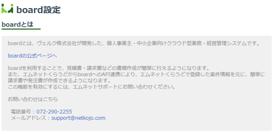 「board設定」画面を開くと、board連携に関する概要の説明とお問い合わせ連絡先が表示されます。