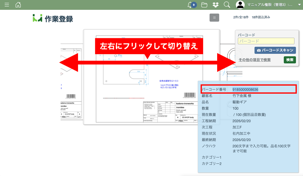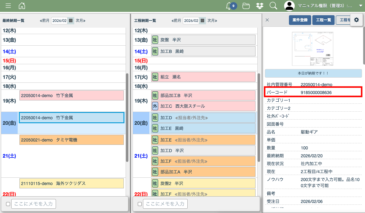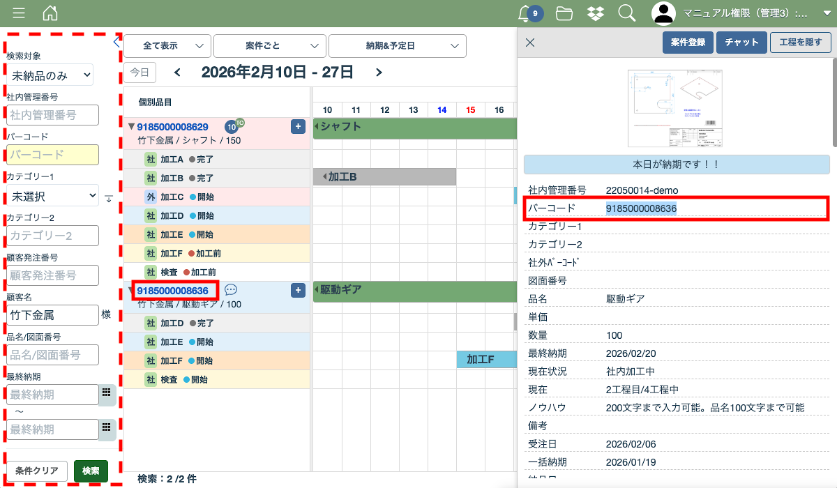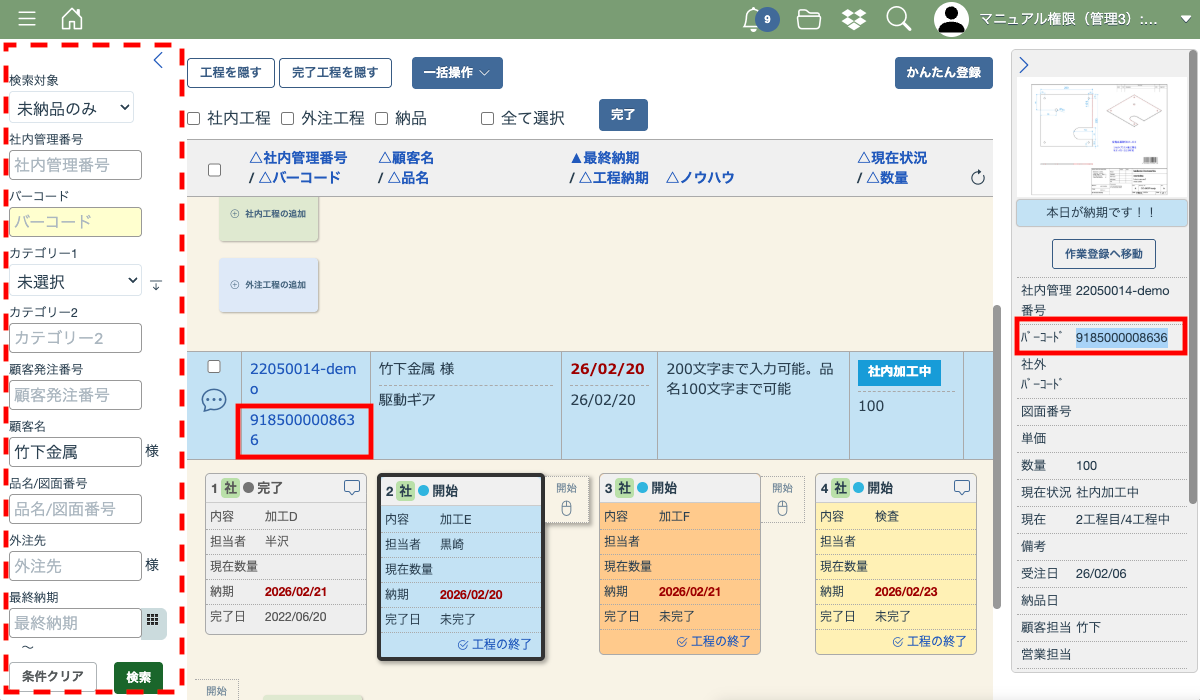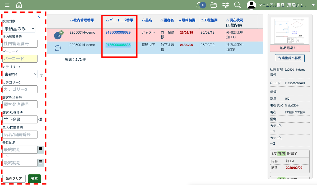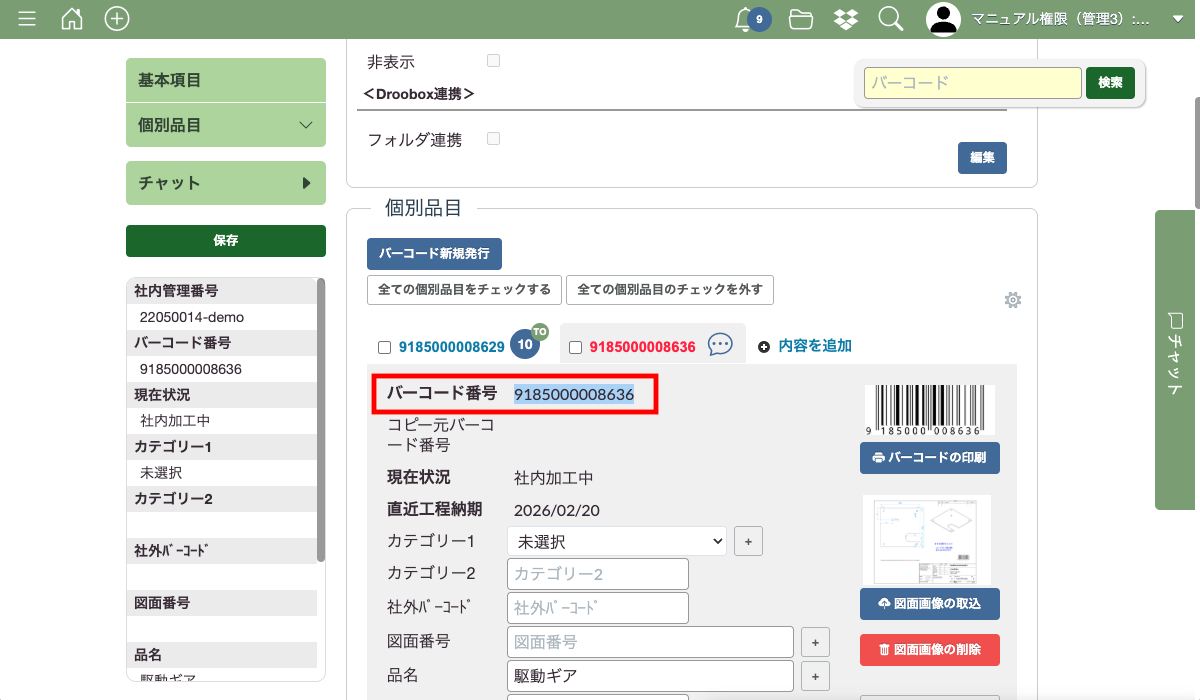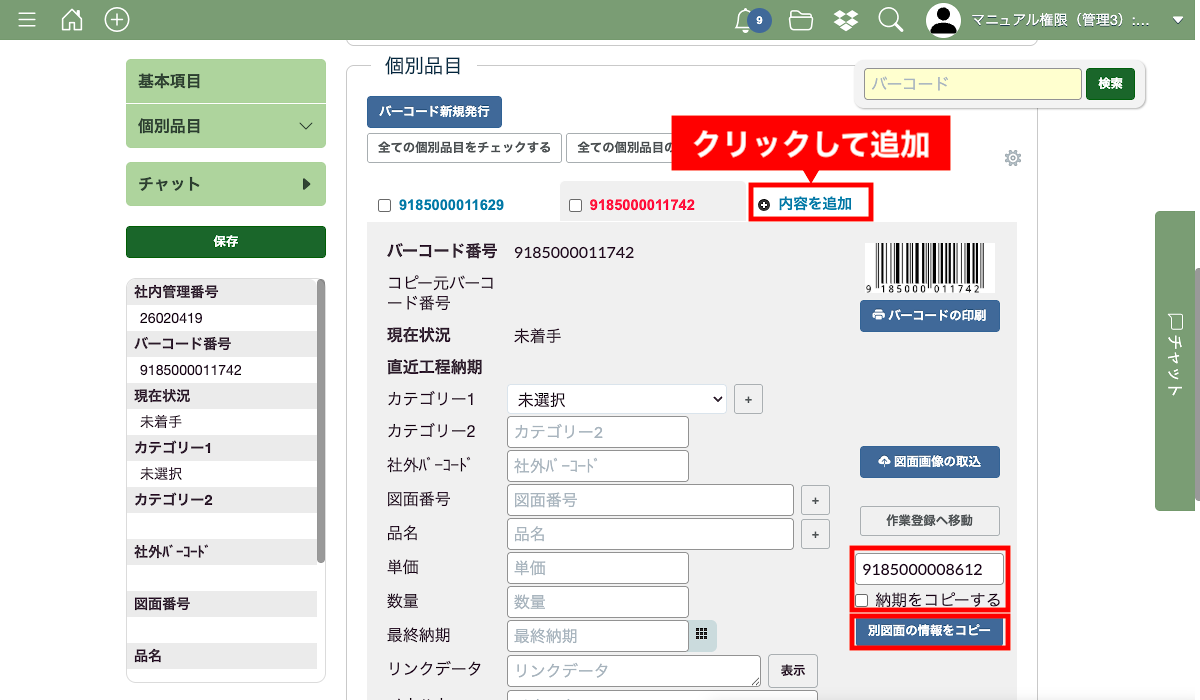 目的の案件の個別品目を検索してバーコード番号を表示する