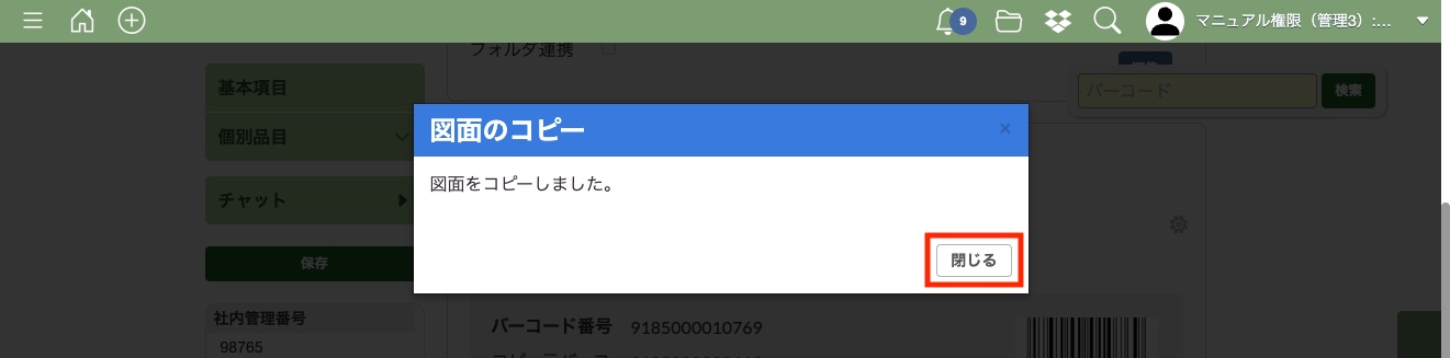 コピー完了後の確認画面が表示されたら「閉じる」ボタンで画面を閉じます。