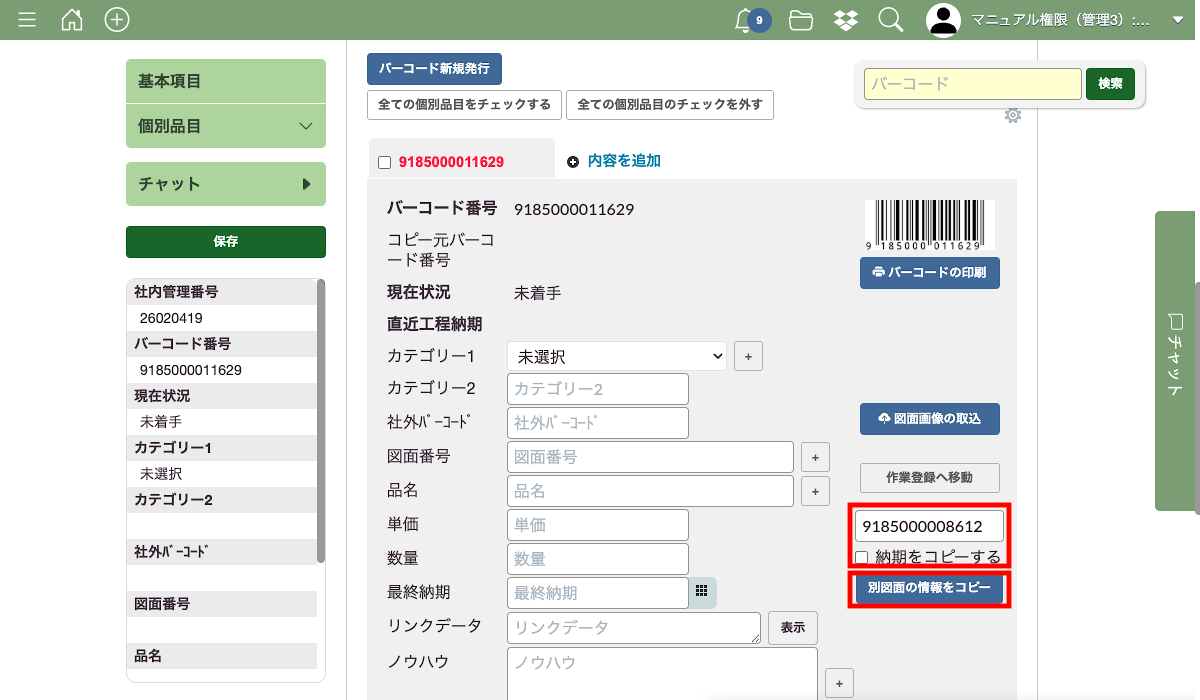 個別品目の「バーコード番号」欄にコピーしたい個別品目のバーコード番号を入力します。
