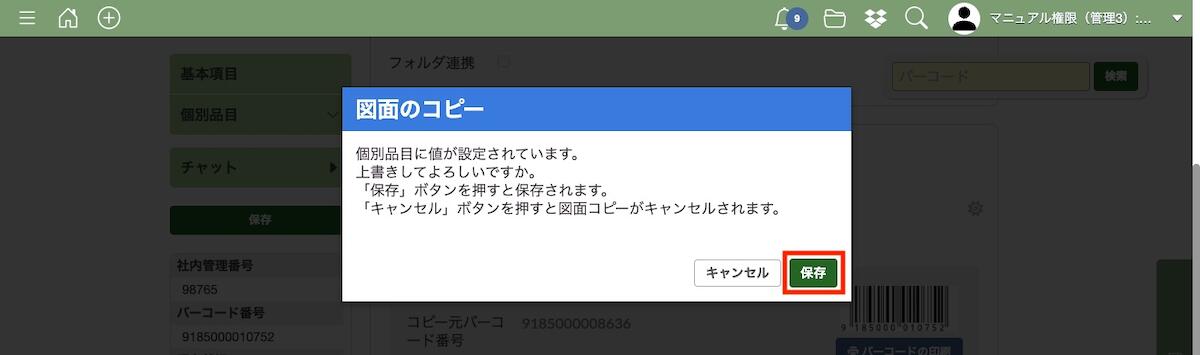 個別品目に値が設定されている時に「別図面の情報をコピー」ボタンを押すと確認画面が表示されます。