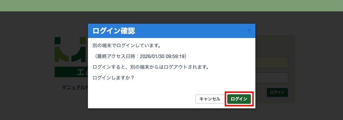 エムネットくらうどからログアウトしないでブラウザを閉じてしまった場合に再度ログインする場合や、同じユーザーIDで誰かがログインをしている場合、ログインをしようとするとログイン確認の画面が表示されます。