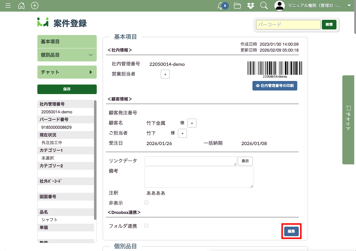 案件登録画面を開いたら、基本項目の「編集」ボタンを押してください。