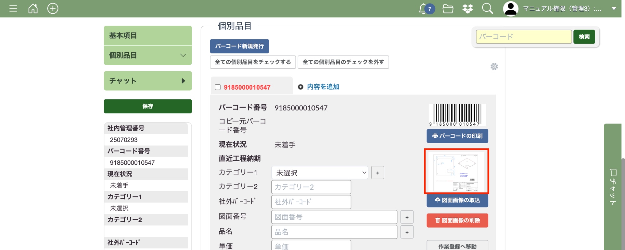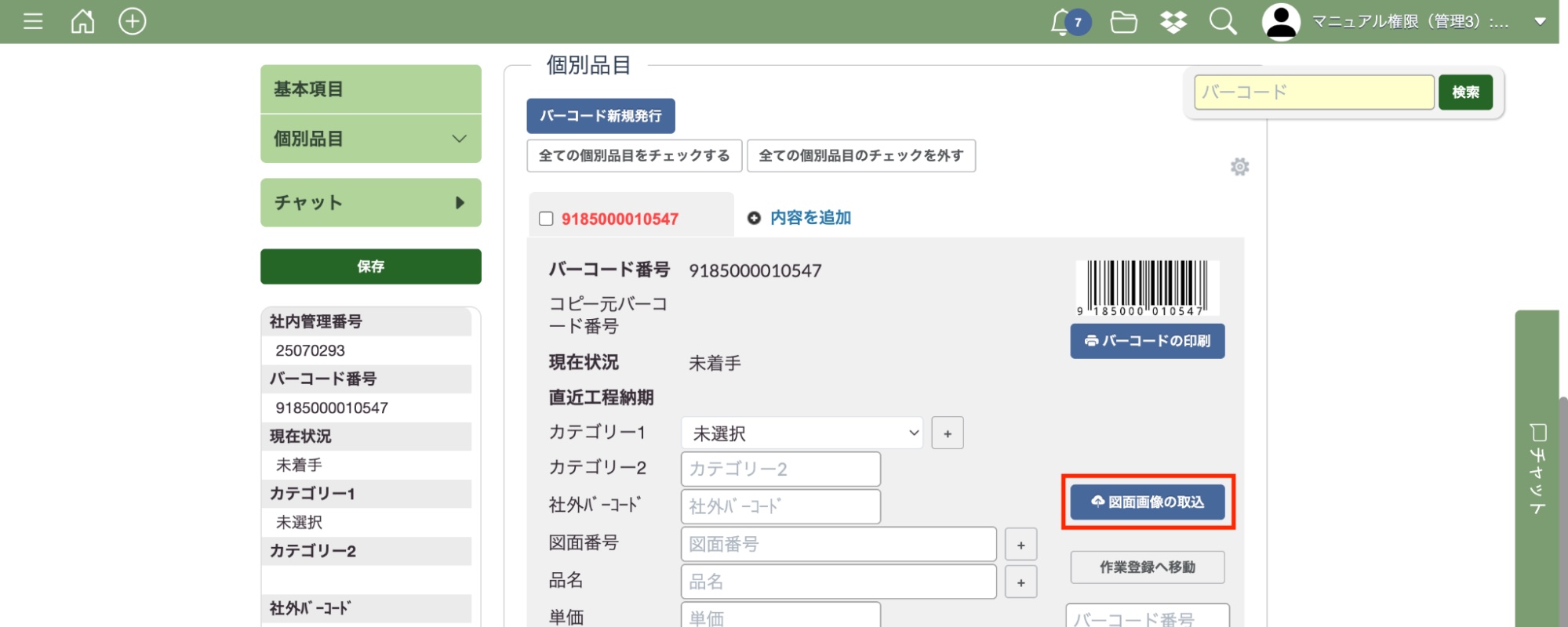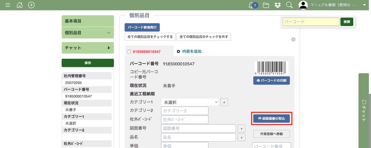 案件登録画面を開いたら、図面画像を登録したい個別品目の編集画面で「図面画像の取込」ボタンを押してください。