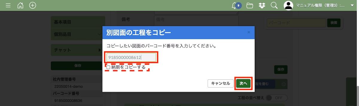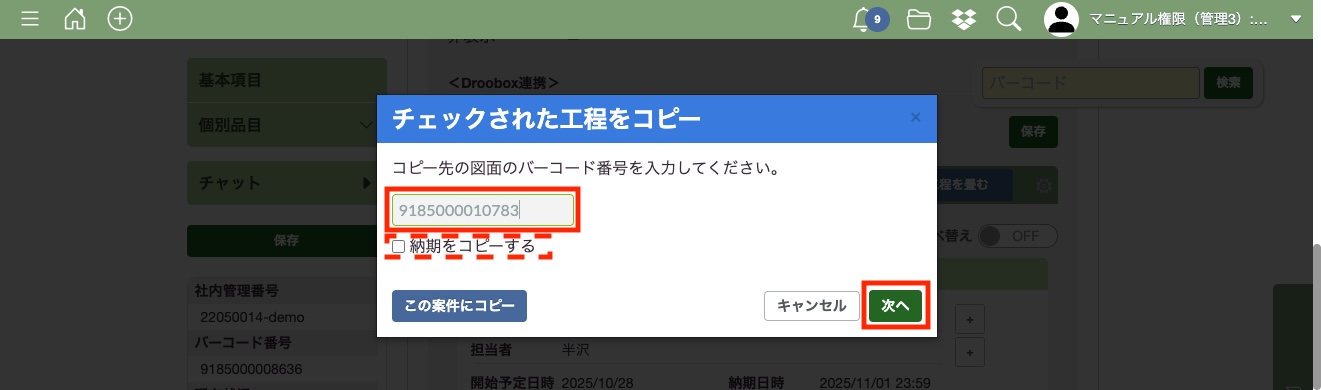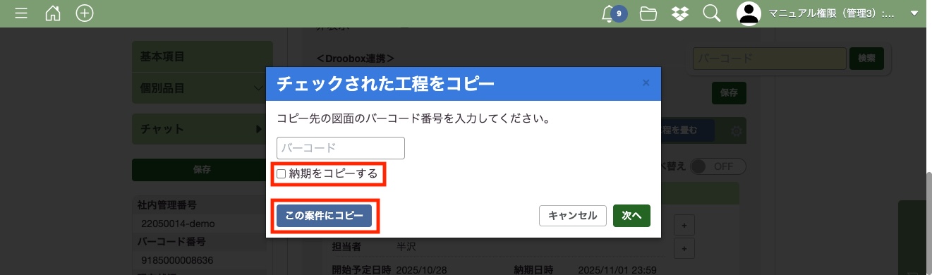 納期もコピーする場合は「納期をコピーする」のチェックボックスにチェックを入れます。バーコード入力欄は空欄のままで「この案件にコピー」ボタンを押します。