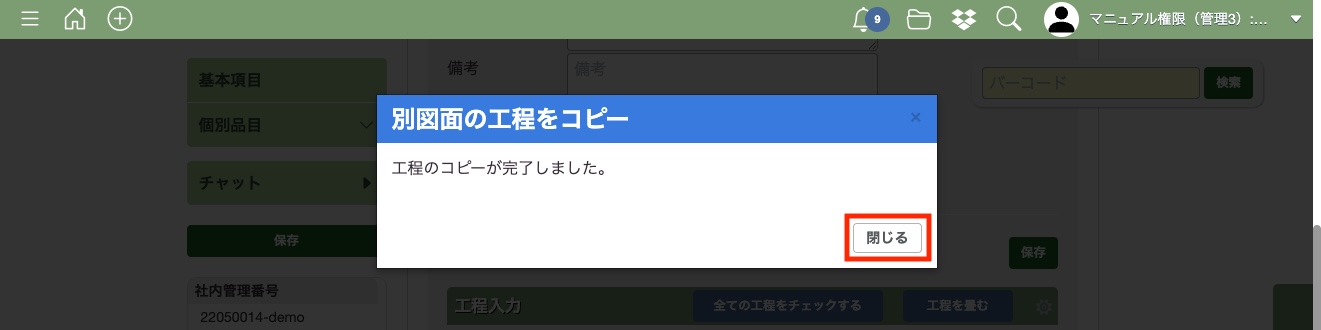 工程のコピーが完了した確認画面が表示されたら「閉じる」ボタンを押して画面を閉じます。コピーした工程が追加されていることをご確認ください。