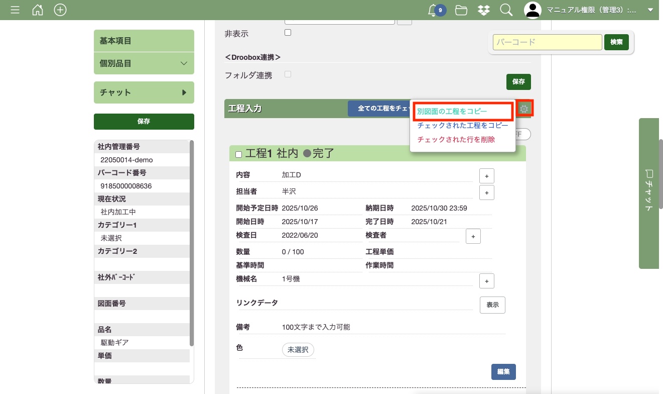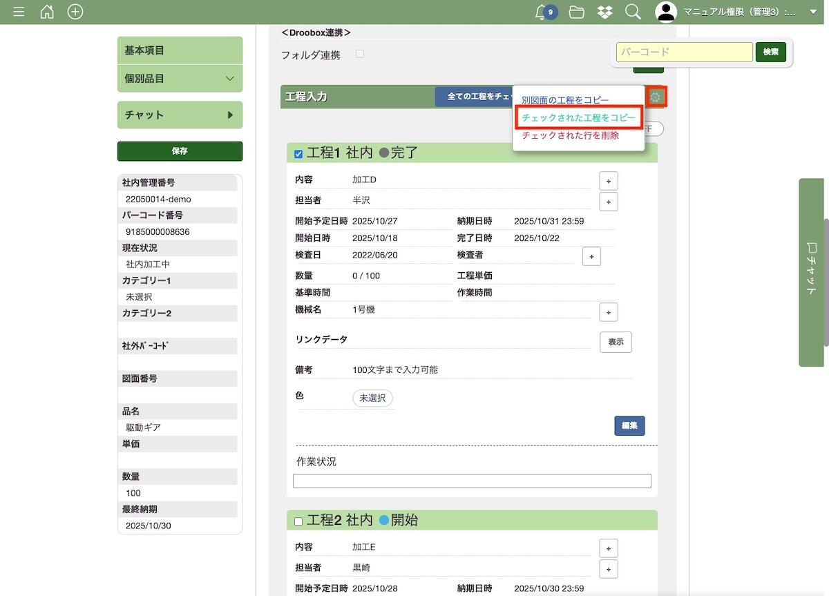 工程入力の右側にある歯車のマークを押してメニューを開いて「チェックされた工程をコピー」を選択します。
