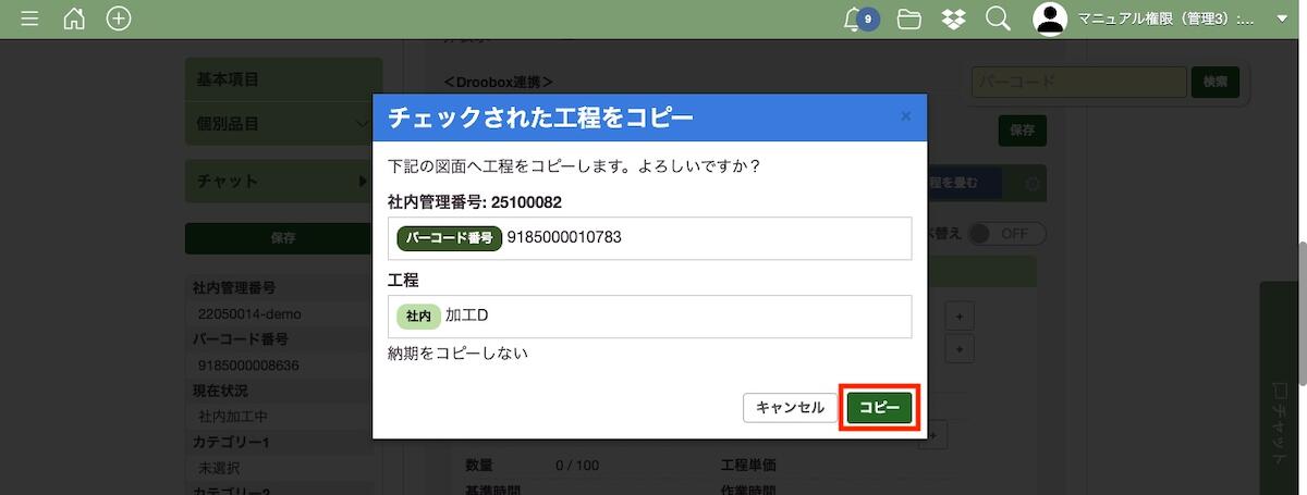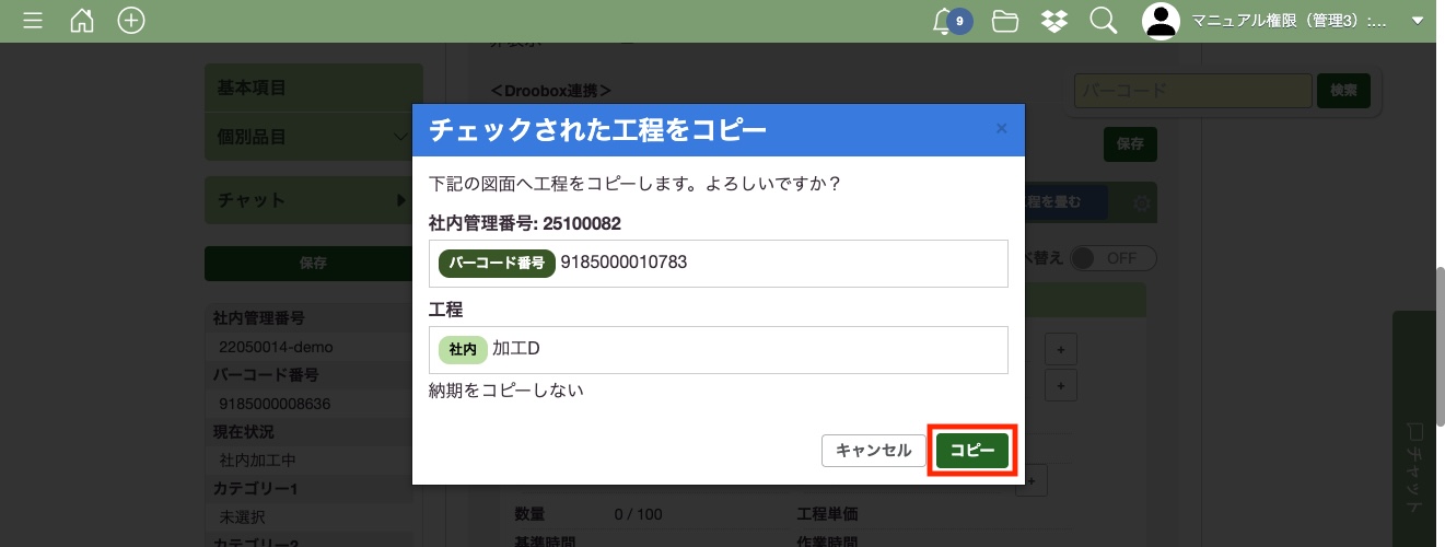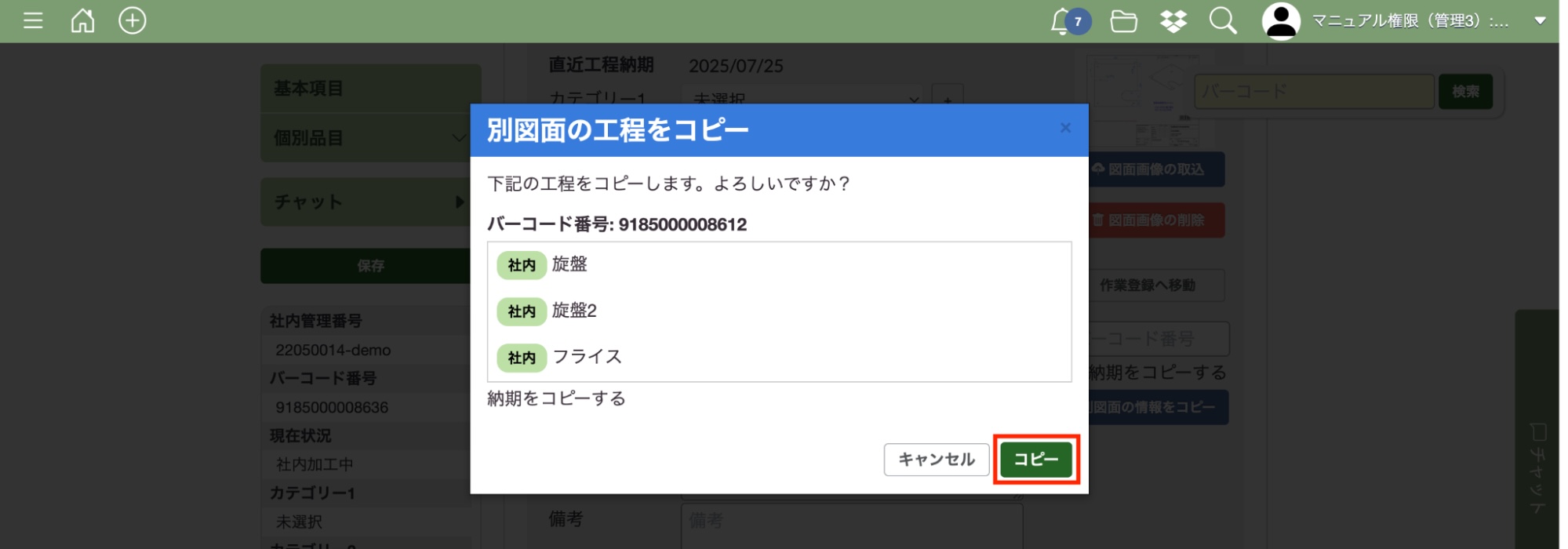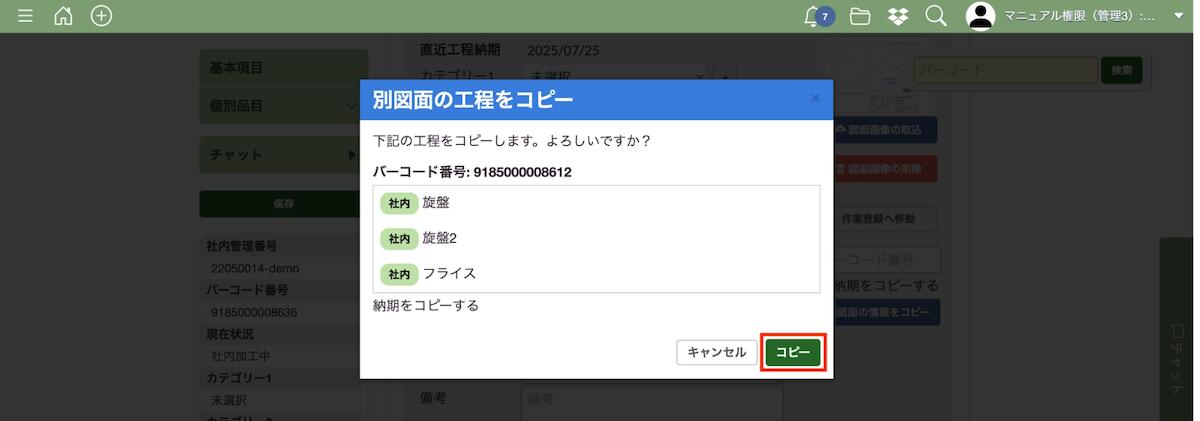 内容を確認して「コピー」ボタンを押すと、表示されている全ての社内工程・外注工程がコピーされます。