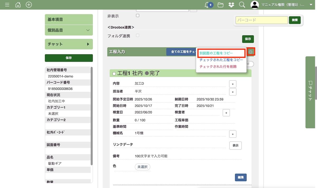 工程入力の右側にある歯車のマークを押してメニューを開いて「別図面の工程をコピー」を選択します。